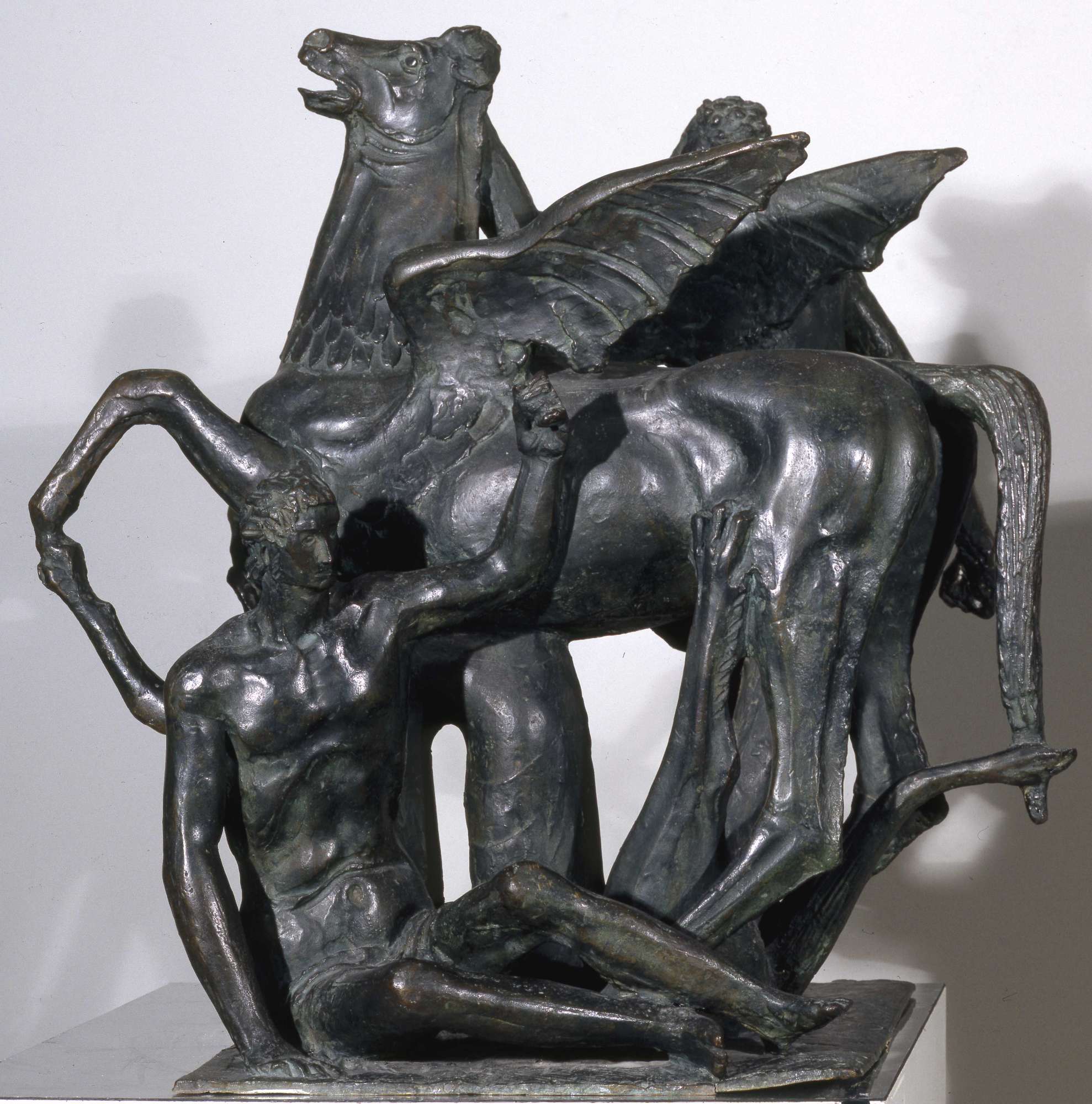 Nel corso del 1936, tramite la permuta di una serie di opere d’arte, il Museo Revoltella ottenne dalla Galleria d’Arte “Trieste” i bozzetti bronzei di Arturo Martini realizzati per il concorso torinese di II grado del 1934, bandito per un monumento a Emanuele Filiberto di Savoia-Aosta da collocarsi nella torinese Piazza Castello. Le quattro sculture in cui si articola il bozzetto pervennero al Museo in tre occasioni diverse. Assieme alla prima scultura di Martini, il busto del Duca, la galleria triestina cedeva nel 1936, anche i Gladiatori di Giorgio de Chirico. Oltre ad assicurarsi la collaborazione di Giuseppe Pagano, per armonizzare il rapporto tra il monumento e la piazza, Martini affidò ad Alberto Savinio il compito di presentare il suo bozzetto. Facendo seguito alla prima fase romana del concorso, nella nuova versione per Torino il bozzetto presentava una rielaborazione dei gruppi laterali che si sdoppiavano, venendo a essere formati ciascuno da quattro figure «capaci di garantire una lettura diversa per ognuna delle due fronti del monumento. Al gruppo della Forza Martini aggregò infatti quello degli Eroi e a quello della Fede la Luce, in una complessa fusione di figure umane, animali e mostruose» (Roberto 1992). Il monumento arcaico da cui lo scultore mutuò l’idea di saldare tali elementi in una immagine unitaria era il doppio gruppo andro-ippo-tritonio del tempio ionico di Marasà presso Locri (V secolo a.C.), di cui lo scultore trevigiano vide la sua ricostruzione pubblicata nel ’27 da Silvio Ferri sul «Bollettino d’Arte». Il potente impatto dell’articolato monumento, derivato dalla sua perfetta bifrontalità, resa mediante la disposizione diagonale dei gruppi allegorici laterali e mediante l’accostamento della figura del duca a un blocco di granito il quale, in direzione del Po fungeva invece da sfondo all’incontro di San Marco e San Giusto, destò subito l’attenzione della critica. La figura del Duca, inoltre, era prevista intera nel monumento definitivo e non limitata al solo busto, come nel bozzetto qui esaminato. Nella terza e ultima fase del concorso Martini sostituì i gruppi allegorici laterali con due enormi clessidre con cariatidi, variante che probabilmente spinse la commissione ad assegnare la vittoria allo scultore pugliese Eugenio Baroni, unico scultore assieme a Martini giunto al termine del lungo processo concorsuale, annunciato il 30 marzo 1935. In conclusione, «le novità e gli squilibri del nuovo assetto compositivo che non offriva un punto di vista privilegiato ma richiedeva circolarità di sguardi per assecondare il profilo delle clessidre si contrapponeva all’assoluta chiarezza del progetto di Baroni, alla scansione paratattica del suo monumento in cui ogni singola figura, proiettata sullo sfondo scuro di un parallelepipedo in pietra, era leggibile in tutti i suoi particolari e si offriva a una fruizione lineare e analitica» (Roberto 1992). Nel 1933, anno in cui ebbero inizio le vicende del travagliato concorso per il monumento al duca, Martini si era appena trasferito dalla località di Vado a Milano, dove condivideva la propria abitazione-studio con Mirko Basaldella e Corrado Cagli, giunti nel capoluogo lombardo per partecipare alla Triennale. Lo scultore trevigiano, che due anni innanzi aveva ottenuto il premio massimo per la scultura alla I Quadriennale romana, s’impegnò moltissimo per il concorso che sperava fortemente di vincere. E se è vero che, di tutta l’attività scultorea di Martini, le grandi opere su commissione perdettero sempre qualcosa della sua straordinaria personalità artistica, nondimeno nel monumento al duca egli seppe dare ancora il meglio di sé. «Qui l’artista vive la sua vita piena – scriverà di lui Marziano Bernardi dinanzi al progetto per il monumento – la sua vita traboccante di immagini e di forme, perché inventa, perché fa nascere dal nulla la bellezza [...]. Che importa il simbolo? Qui è la decorazione magnifica che prorompe e trionfa con una felicità di trovata che di colpo avvolge e rapisce l’osservatore» (Roberto 1992).
