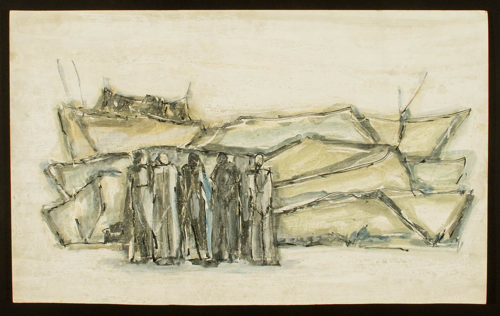 La gita in campagna, opera di Mario Peragallo, atto unico. Paesaggio campestre sullo sfondo con gruppo di sei persone abbozzate