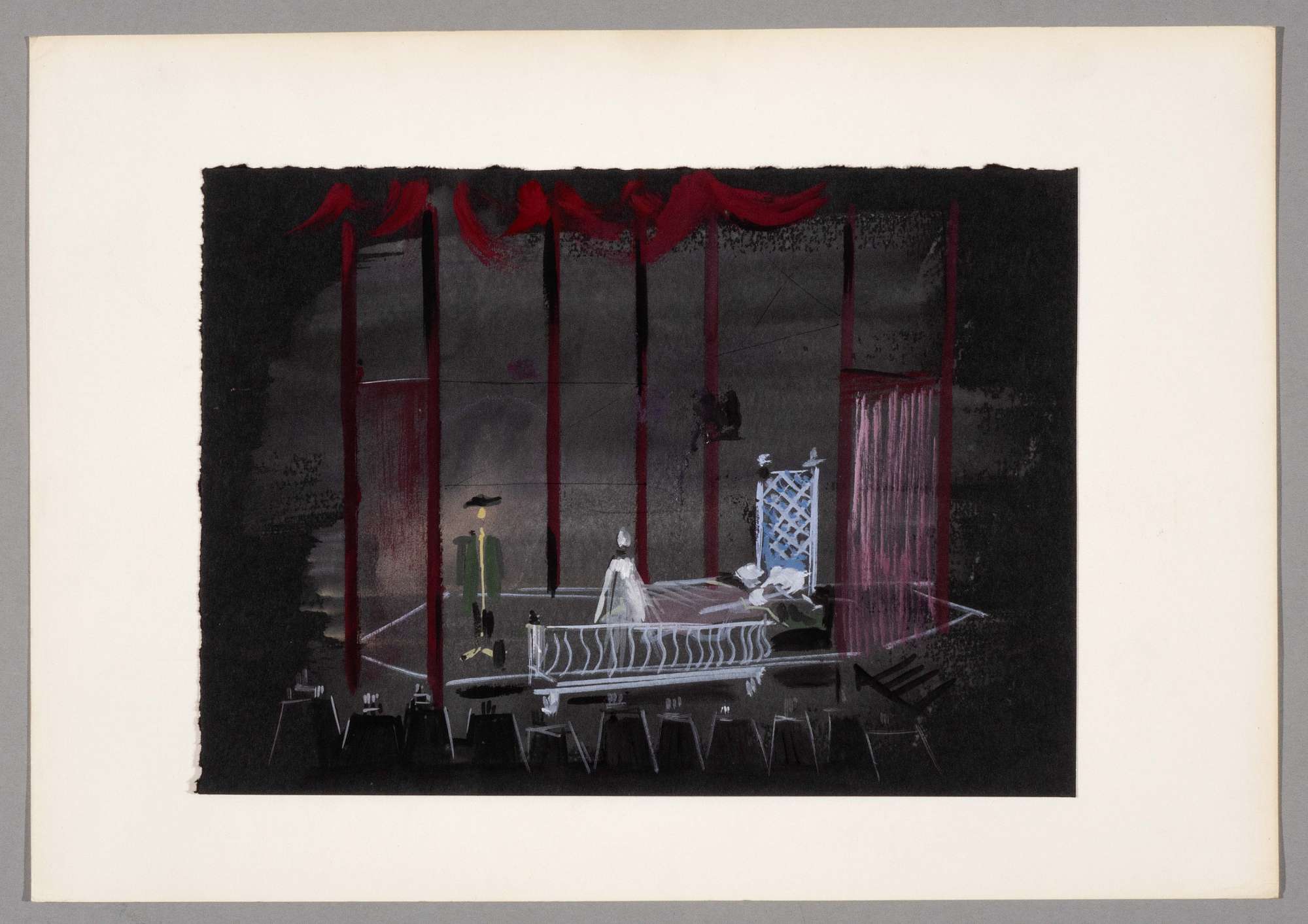 La morte di Danton, dramma di George Büchner. Interno, camera con praticabile raggiungibile da brevi scale da destra e protetto da una porzione di ringhiera. Sulla pedana un letto con testiera alta, porta abiti a omino, figura femminile. Serie di elementi trapezoidali allineati sul proscenio