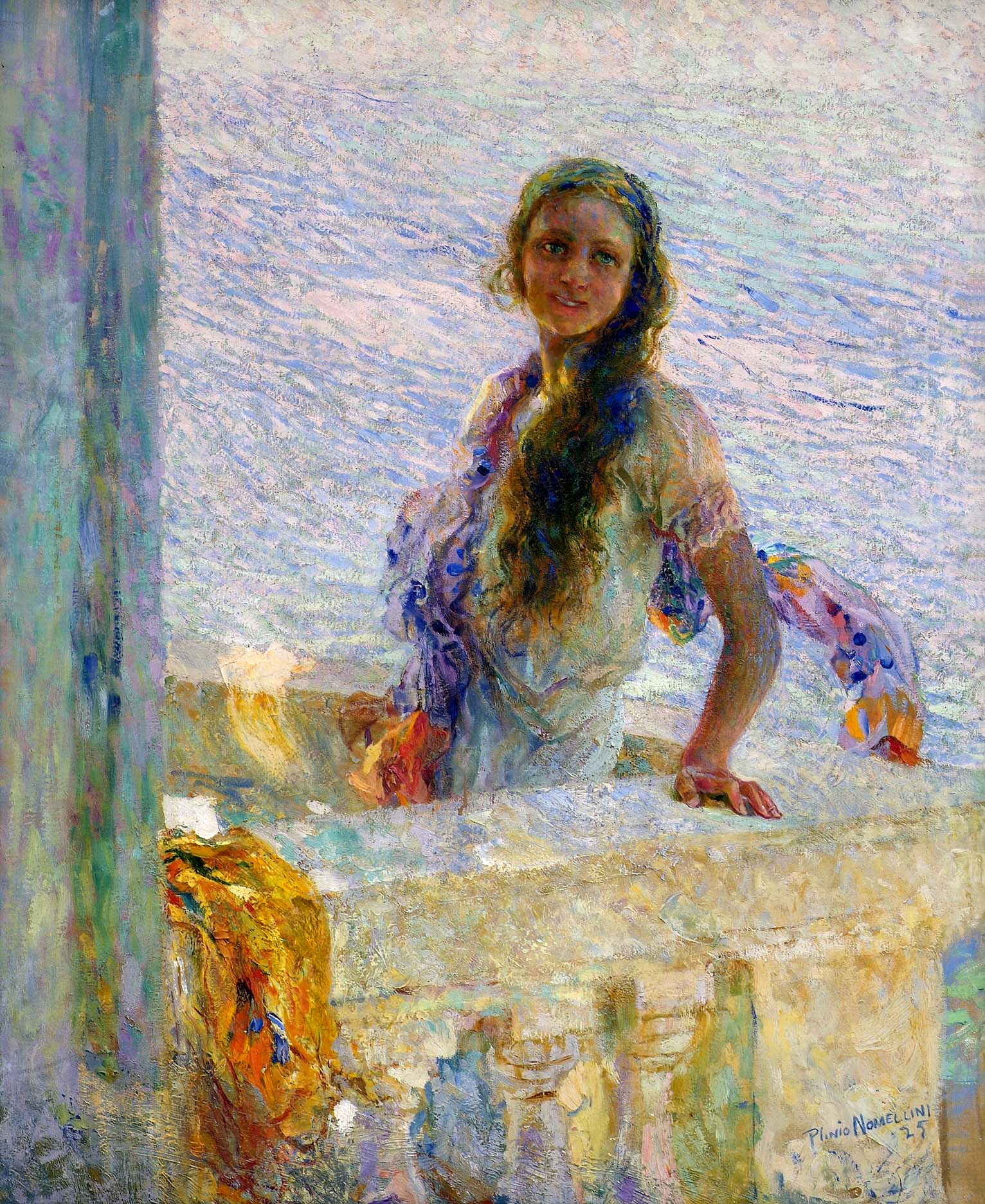 Il 25 febbraio 1927 nel verbale della seduta del Curatorio di quel giorno si dichiarava di “aver ricevuto in consegna il quadro di Nomellini “Primavera” dono del Comm. Castiglioni di Vienna.” Il dipinto, realizzato nel 1925, anno in cui il pittore livornese pronunciò il discorso per il monumento a Giovanni Fattori a Livorno, appartiene a quella fase della sua produzione artistica in cui, ormai svincolatosi dall'adesione più completa alle teorie divisioniste della luce (opere dell'ultimo decennio del XIX secolo, come Il golfo di Genova, Il naufrago, La pesca, ecc.), Nomellini sperimentava “un suo personalissimo divisionismo a pennellate più grandi con colori accesissimi, quasi «fauve»”. Anche se, come specificava la nipote Eleonora Barbara Nomellini, qualsiasi teoria fu sempre per lui “solo il mezzo per rappresentare anche con forma nuova gli stati d'animo, che sentiva urgere in sé.” Lo studio della luce e dei conseguenti effetti di quest'ultima sul colore nelle diverse ore della giornata, problema ‘cardine' della pittura impressionista, impegnò il pittore fin da giovanissimo: “Anche quando ero piccolo, -scriveva negli Appunti autobiografici, conservati presso l'Archivio Nomellini a Firenze- ricordo, seguendo mio padre alla caccia con la civetta, non curavo gli uccelletti […] mi estasiavo del primo sole che, traverso le ragnatele tra l'una e l'altra fronda, indorava quei sottili velami. E le nubi, e la luna errante, e le schiume marine, sembravami che per me svariassero le nubi nell'abisso celeste, componevano apparizioni veloci di giganti, l'onda, nel trapasso sembrava come nella sua rete verde, rotolasse grandi serpenti lucidi.” Vi è in nuce in questa descrizione -scrive ancora la nipote dell'artista- “l'osservazione della luce, la natura concepita come meraviglia che sconfina nel fantastico e si inviluppa nelle raffigurazioni del mito. E luce, natura, mito, sono il cardine del suo sentire, del suo cercare di esprimere con la pittura tutto quello che turbinava nella sua anima.” (Eleonora Barbara Nomellini, 1998) Luce, colore e trasfigurazione mitica in uno spazio naturale aperto e apparentemente infinito sono anche i caratteri peculiari del dipinto del Museo Revoltella, in cui forse l'artista, amico di poeti (Giovanni Pascoli) e musicisti (Giacomo Puccini), ritrasse una delle figlie in età adolescente, Laura, sul balcone di una casa al mare, magari a Quercianella, in provincia di Livorno, dove la famiglia Nomellini trascorse i periodi estivi tra il 1924 e il 1926. Come una brezza estiva, il cui andamento sembra ribadito dalle insistite stesure pittoriche trasversali, la fanciulla, sfolgorante nella sua giovinezza, si inserisce perfettamente nello spazio circostante, vivificata da accensioni cromatiche di notevole intensità e bellezza. L'opera di Nomellini, unico dipinto del pittore livornese nelle collezioni del Museo Revoltella, partecipò alla Biennale veneziana del 1926 (assieme a Odisseo e a Murmure d'onda), alla mostra personale del 1966, tenutasi a Livorno (Museo Civico Villa Fabricetti) e a Firenze (Palazzo Strozzi) e, recentemente, alla esposizione Plinio Nomellini. I colori del sogno, presso il Museo Civico «G. Fattori» di Livorno (1998).