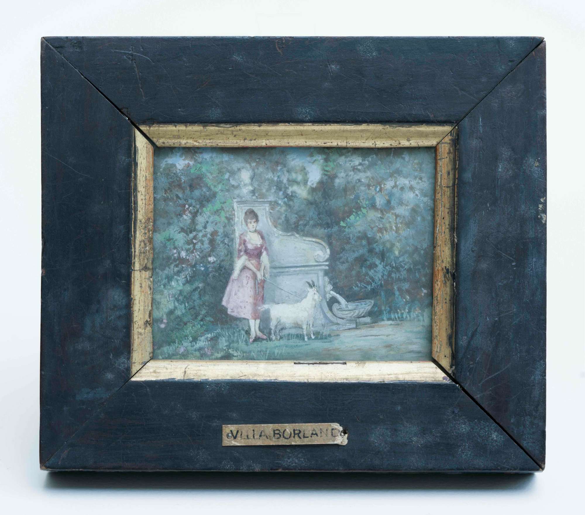 Dando credito alle informazioni inventariali, la miniatura dovrebbe raffigurare la moglie dell'imprenditore britannico Iver Borland nel giardino della loro villa triestina, che si estendeva dai pendii di Chiarbola Inferiore fino alla riva del mare in Campo Marzio. Borland, giunto a Trieste attorno al 1815 attratto dalle franchigie vantaggiose del porto franco, investì ingenti capitali tra il 1835 e il 1838 per acquistare terreni siti nella zona di Chiarbola inferiore, spingendosi poi in una serie di speculazioni edilizie che lo portarono al dissesto finanziario. Egli sposò Maria Marsch originaria di Semlino, da cui ebbe tre figli: Edoardo, Eleonora e Alberto; famiglia, che non trasferì mai a Trieste e che, alla sua morte, lasciò nella profonda indigenza (Seri, Degli Ivanissevich 2009, p. 171). Della villa triestina inoltre è nota una stampa, datata 1848, che ne riproduce soltanto l’ingresso (Trieste, Biblioteca Civica). Nelle note inventariali è stata trascritta parzialmente l’iscrizione “Stimat.ma Sig.ra […] Volta Bory”, che, essendo sul retro, non è stata direttamente esaminabile. Nell’impossibilità di individuare precisamente l’iconografia, una datazione agli anni trenta-quaranta del secolo sembra plausibile per la piccola opera di autore non identificato dal tratto veloce e compendiario.
