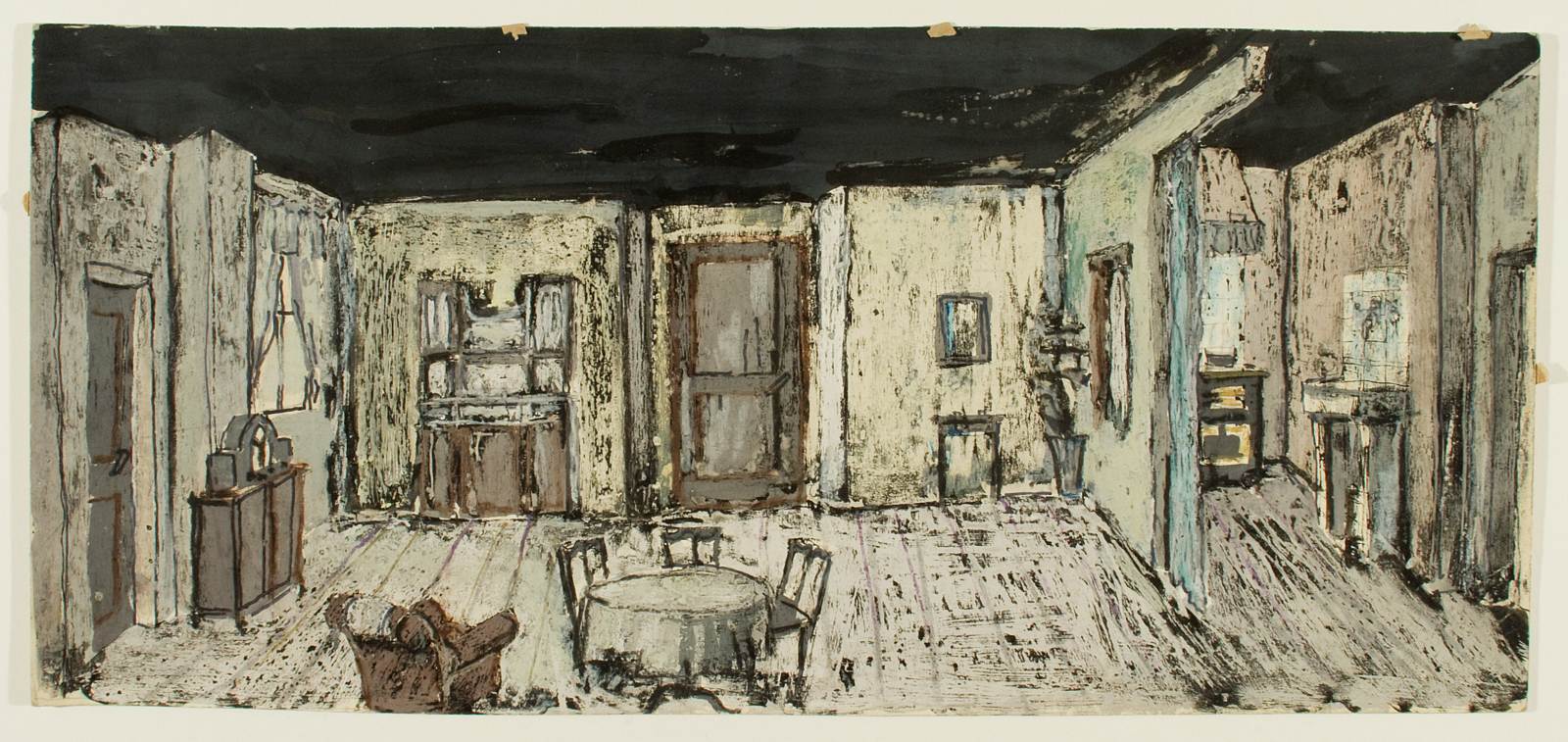 Una domenica, opera di Mario Bugamelli, atto unico. Casa popolare, interno; spaccato di sala da pranzo e cucinino con mobilia povere
