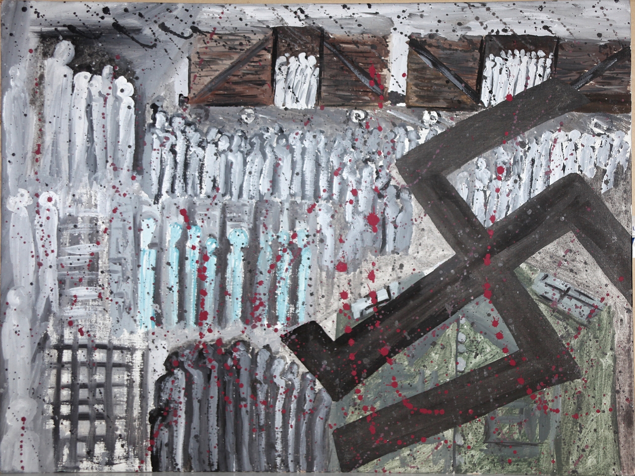 Il lavoro presenta una croce uncinata nera sulla destra, che in parte rimane fuori dalla tela. Sullo sfondo un contesto di prigionia: in alto due vagoni di un treno in cui si vedono molte figure; al centro e a sinistra ancora figure e in basso a sinistra sbarre grigie. Le figure sono estremamente stilizzate e dipinte con colori chiari, grigio e azzurro, fatta eccezione per quelle in basso di un grigio più scuro. Su tutta la tela schizzi di colore, nero soprattutto in alto e rosso scuro.