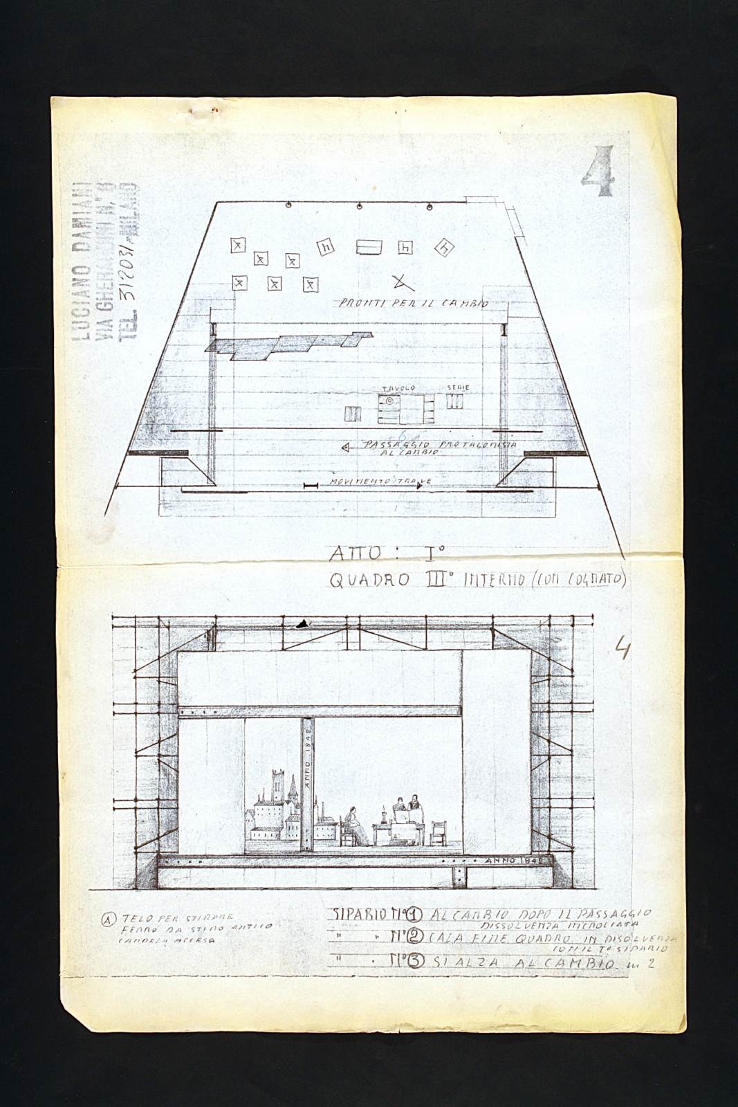 Motivo di scandalo e di riflessione, due tempi di John Osborne. Spazio del foglio diviso orizzontalmente in 2 parti: in alto pianta del palcoscenico, in basso bozzetto scenografico per interno: stanza con sedie e candelabro, 3 persone, città sullo sfondo