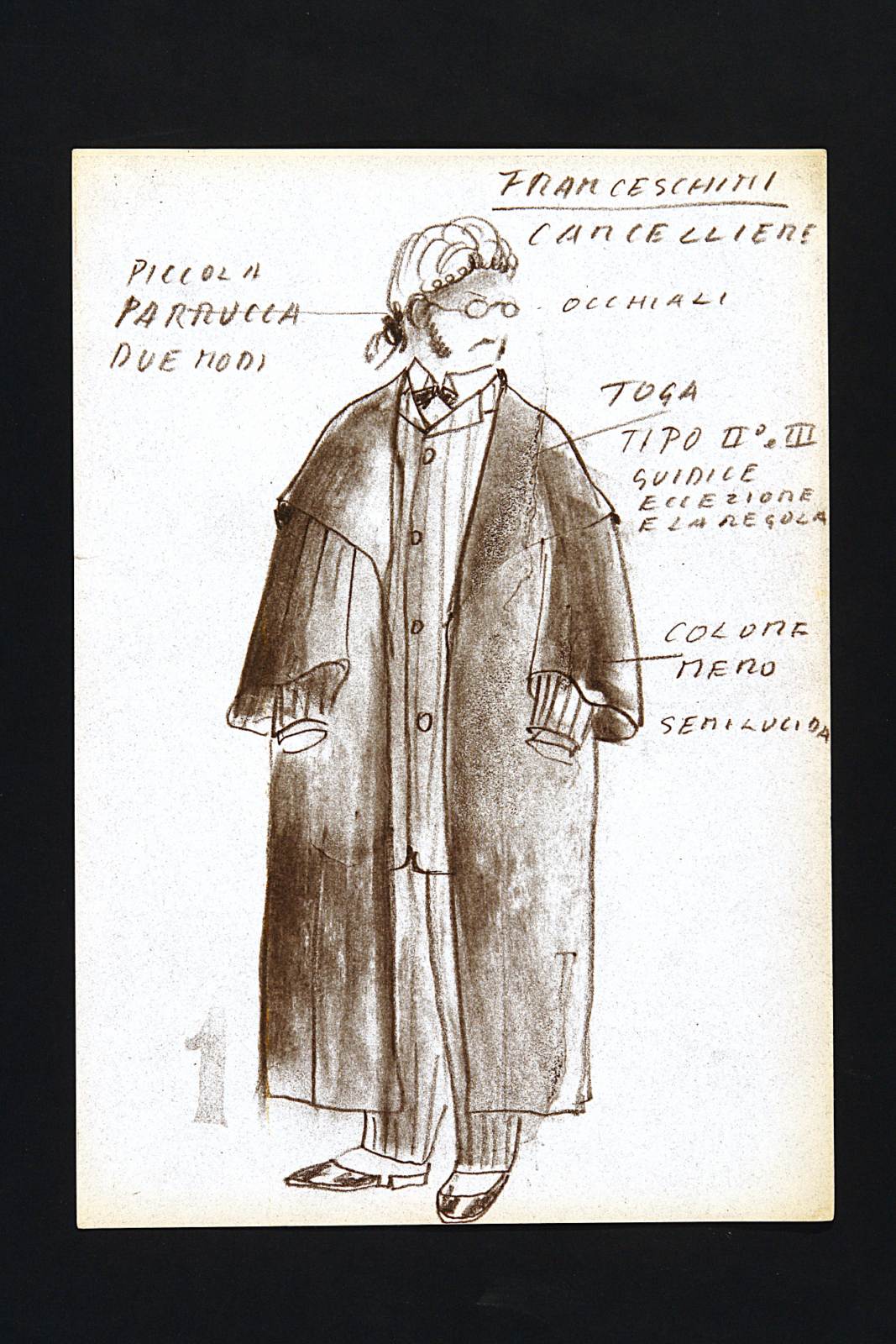 Figurino per Motivo di scandalo e riflessione di John Osborne, traduzione di Paola Ojetti, novità per l'Italia in edizione integrale; regia di Raffaele Maiello. Trieste, Auditorium, 19.01.1996-13.02.1996
