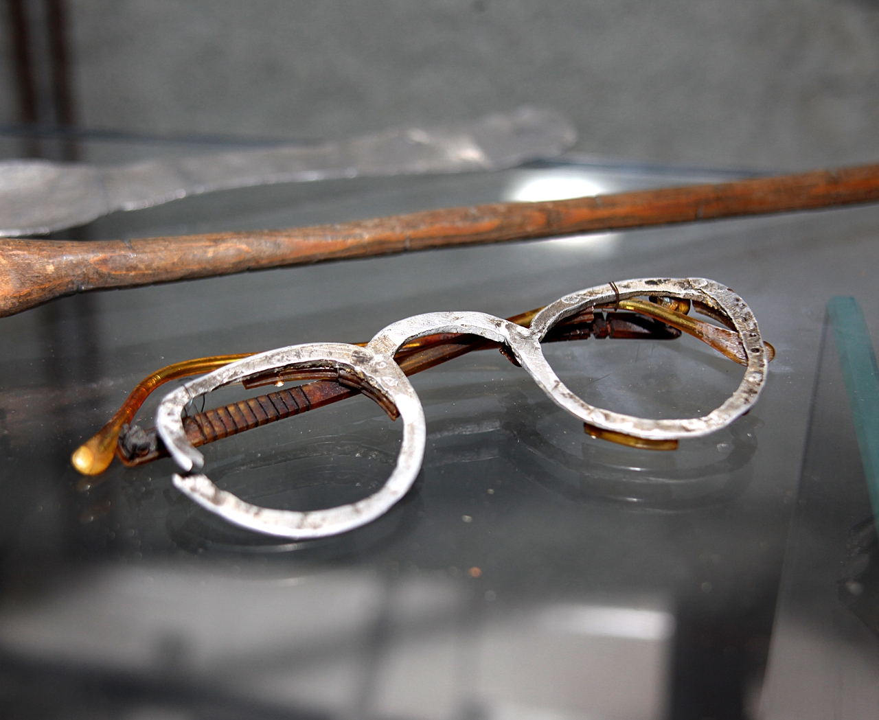 Gli occhiali sono stati costruiti in maniera artigianale, il fusto è in metallo, le stanghette sono state recuperate da un altro paio di occhiali e assemblate. Risultano mancanti le lenti.