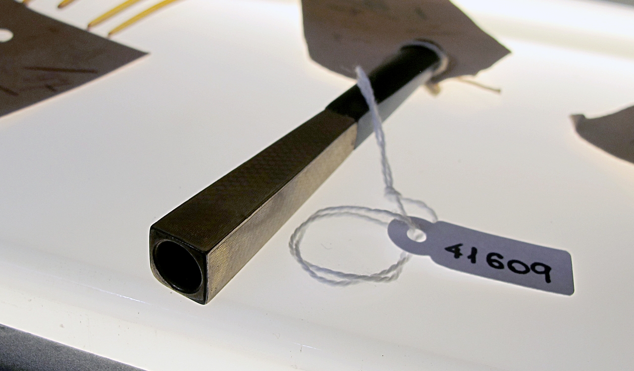 Il bocchino fa parte del nucleo di oggetti razziati dai nazisti dalle case degli ebrei triestini. Ha una parte in metallo e una parte in bachelite di colore scuro.
