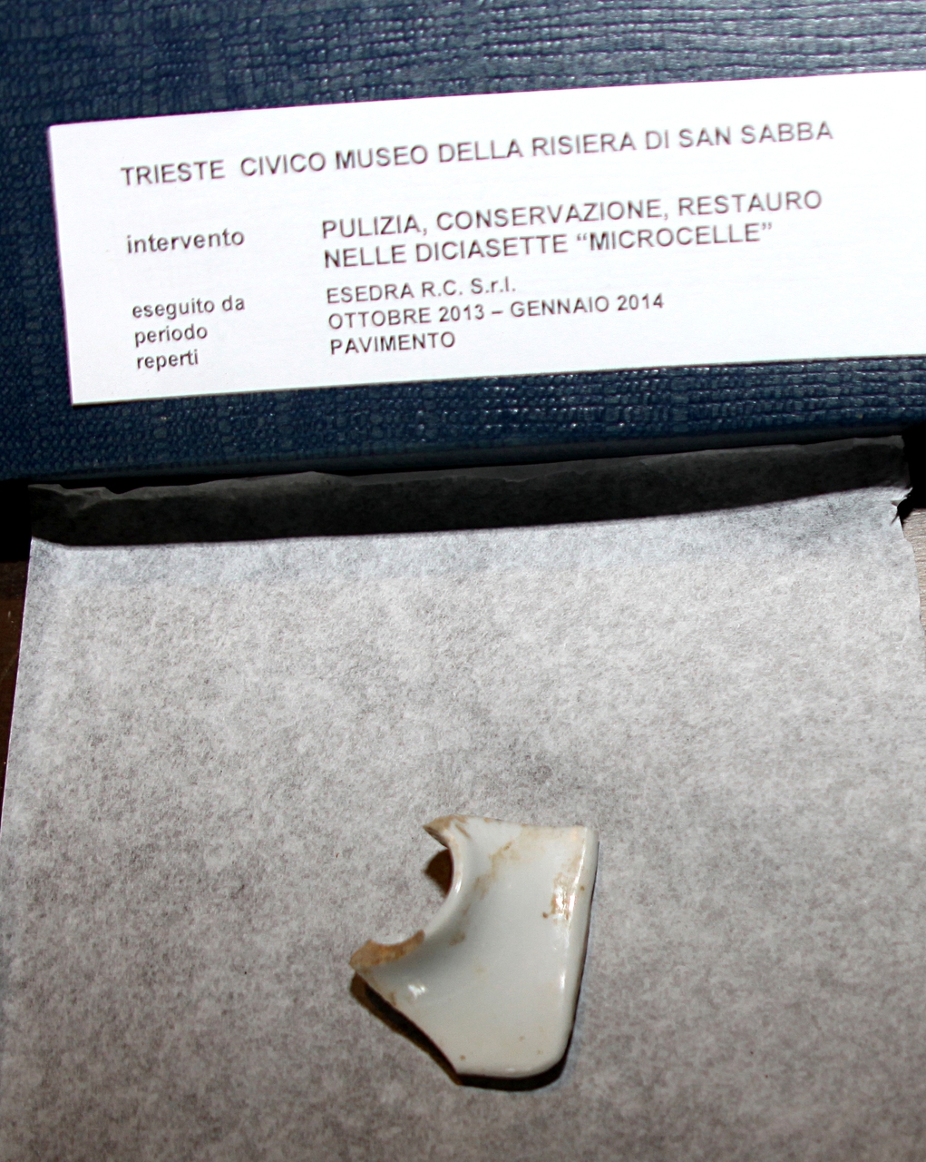 Fa parte di un nucleo di oggetti rinvenuti nel locale detto delle "microcelle" nel dicembre 2013 nel corso di un intervento di pulizia, conservazione e restauro.