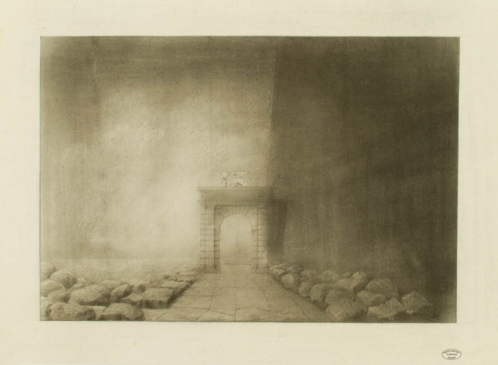 Otello, opera di Giuseppe Verdi, atto 1., castello. Esterno con muraglia e strada lastricata affiancata da massi, portale ad arco in bugnato sovrastato da scultura di leone alato con libro, mare sullo sfondo