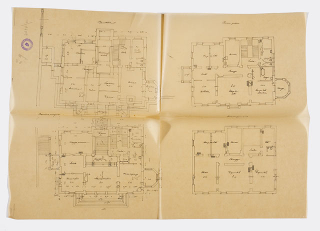 Disegno quotato a penna su carta. Contiene le planimetrie del piano terra, del piano terra rialzato, del primo e del secondo piano di un villino a uso privato. Scritte all'interno dei locali indicano la loro destinazione d'uso.