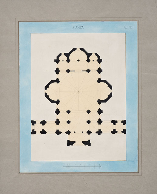 Entro passe-partout riquadrato, disegno ad acquerello, raffigurante planimetria di una chiesa di rito orientale, incorniciata da una fascia azzurra. Il disegno, eseguito a penna e inchiostro nero, ha le sezioni delle murature campite in nero, gli ambienti in giallo, ed è completato in basso al centro da una scala grafica con iscrizione. Nella planimetria, si riconoscono un corpo aggettante in facciata, fiancheggiata da due torri campanarie a base quadrata, un nartece, le tre navate terminanti con altrettante absidi semicilindriche e un transetto biabsidato.