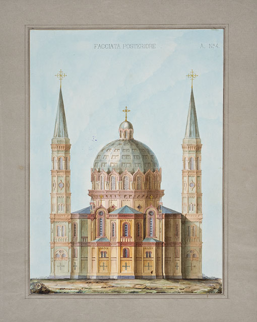 Entro passe-partout riquadrato, disegno ad acquerello, raffigurante la facciata posteriore di una chiesa di rito orientale. Si riconoscono le tre absidi, il transetto biabsidato su cui si erge la cupola e i due campanili.