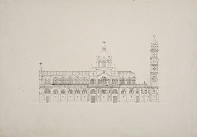 Si tratta di uno dei disegni del "Progetto di chiesa di tipo romanico con pianta a croce latina, con campanile posteriore" (cfr. CMSAOAR10_4129 - CMSAOAR10_4134), pervenuti nel 1953 nelle collezioni dei Civici Musei di Storia ed Arte attraverso l’acquisto Lituano Samero.