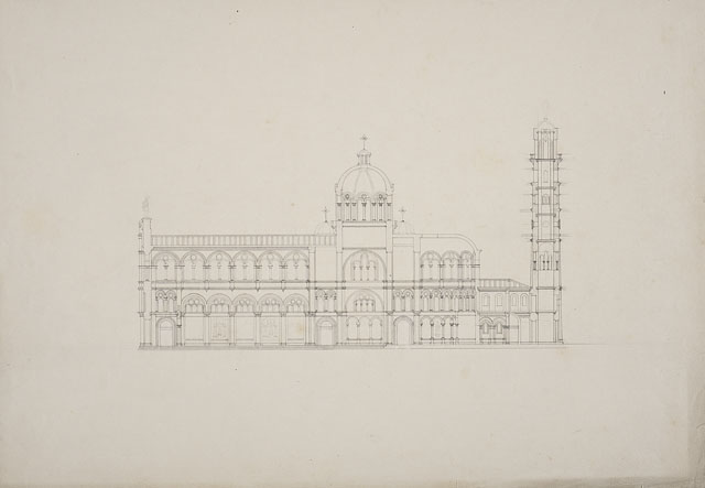 Disegno a penna e matita, raffigurante la sezione longitudinale di una chiesa con pianta a croce latina e campanile in asse con il coro.