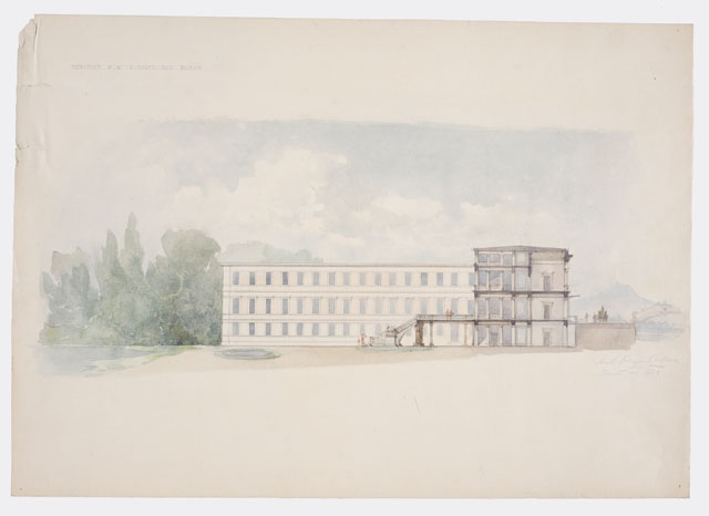 Disegno a matita e acquerello policromo, raffigurante la sezione trasversale di un ospedale entro parco. Grande terrazza al primo livello sul retro del corpo principale.