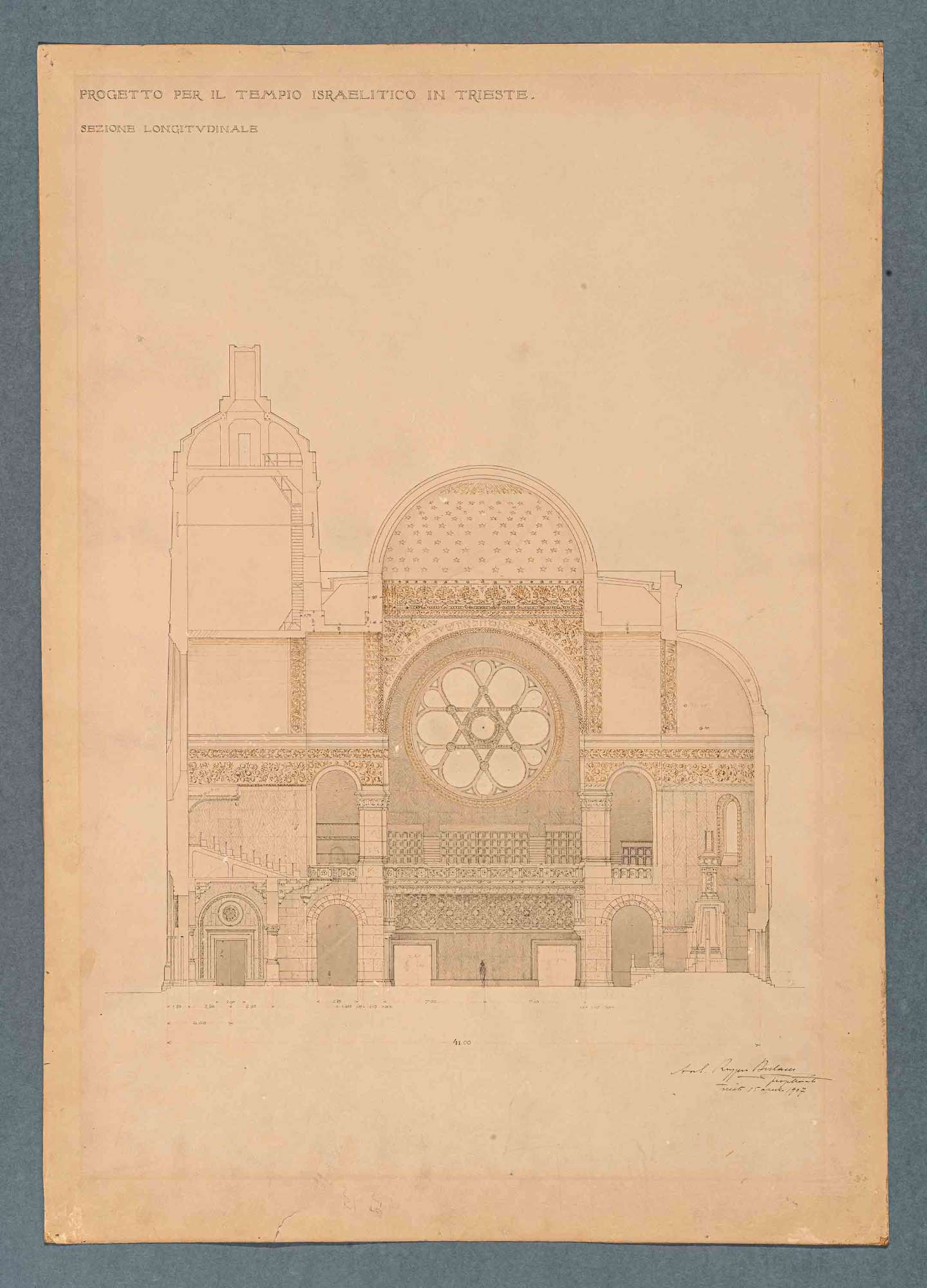 Tavola del progetto della Sinagoga di Trieste (approvato), raffigurante la sezione longitudinale dell'edificio.