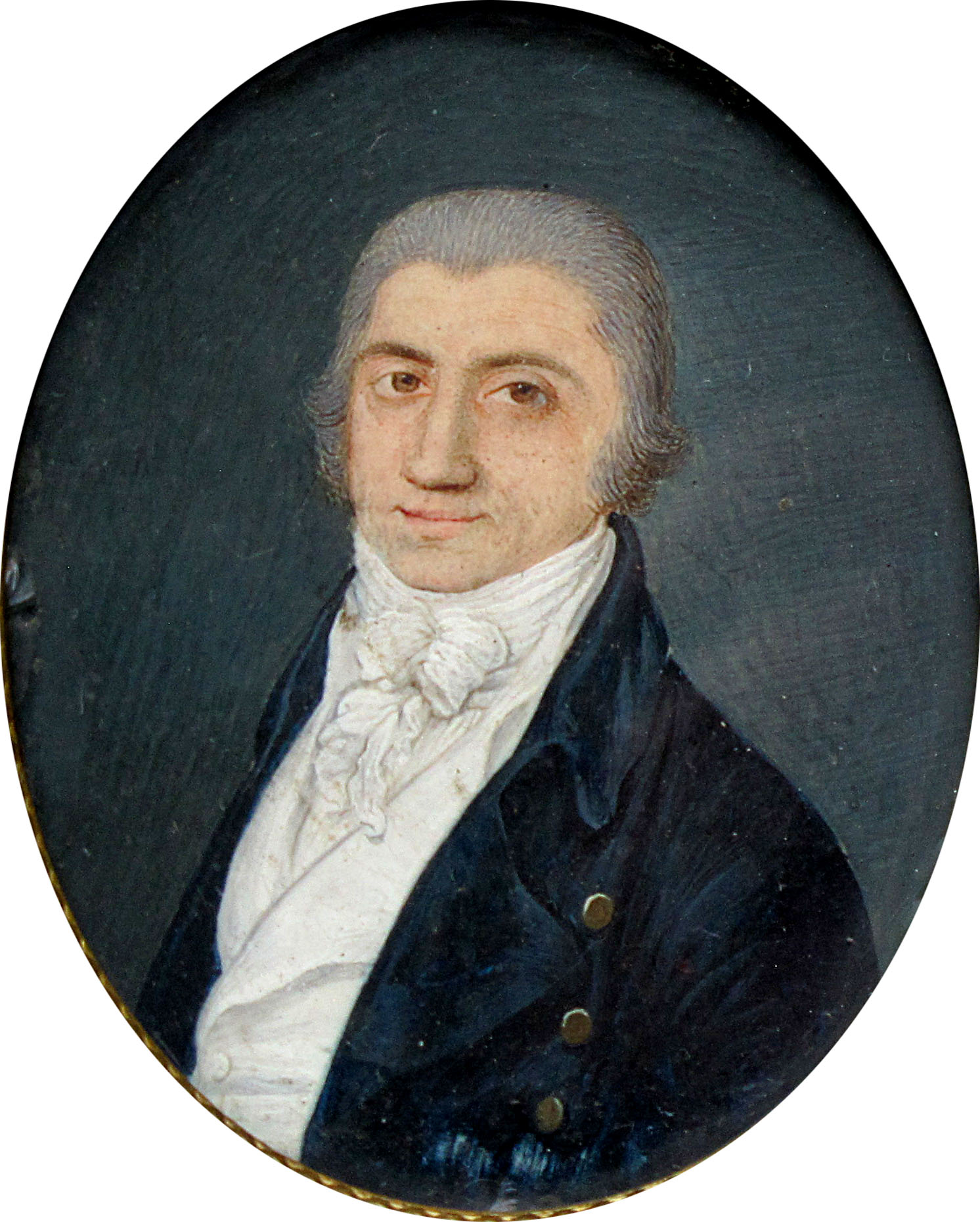 Su un fondo blu emerge l’immagine di un uomo di mezza età, ritratto a mezza figura e volto di tre quarti verso sinistra, mentre indirizza lo sguardo al di fuori dello spazio pittorico. Pervenuta nelle collezioni museali nel 1910 attraverso il legato Zamboni, la miniatura ritrae Filippo Amadio, originario di Napoli e nonno dello scrittore triestino Filippo Zamboni (cfr. Scalessa 2021). Per l’abbigliamento - indossa una marsina blu su sotto-marsina e camicia bianca -, e l’acconciatura, l’opera può essere datata all’inizio del XIX secolo. Dell’effigiato, presso le collezioni civiche si conserva un’altra miniatura (inv. 02288), che ne ricalca l’impostazione, e un ritratto (Ivi, inv. 13/2823).