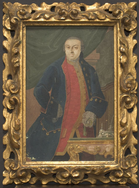 Acquistata nel 1930, la miniatura ritrae Antonio Pietro Rossetti (Fiume, 1722-Trieste, 1814), nato a Fiume da Giovanni Battista, ufficiale di marina della Repubblica di Venezia passato al servizio di Carlo VI, che nel 1740 aveva fissato la sua residenza a Trieste., Antonio Rossetti fu una figura eminente della società triestina per la sua attività di commerciante (promosse la produzione e il commercio di frutta candita e rosoli), armatore e assicuratore. Ricoprì le cariche di direttore di Borsa, consigliere di governo, ispettore dell'Ospedale e delle scuole normali, di preside della fraterna del Rosario. Nel 1775 fu nominato conte da Maria Teresa d’Austria, anno in cui al cognome venne aggiunto il predicato ‘de Scander’; l’anno successivo venne nominato conte da Francesco III, duca di Modena. Nel 1788 fu aggregato al Consiglio dei Patrizi di Trieste. Nel 1748 sposò Orsola, figlia di Domenico Perinello, negoziante, e di Maria Gallina, da cui ebbe dodici figli, l’ultimo il celebre Domenico, nato il 19 marzo 1774. Antonio Pietro Rossetti morì nel 1814, lasciando in dono le pietre per la costruzione della nuova chiesa di Sant'Antonio taumaturgo. La miniatura è in pendant con il ritratto della moglie Orsola Perinello (CMSA inv. 13/2533). Dell’effigiato sono noti alcuni ritratti a pastello (già proprietà del conte Domenico Rossetti) e a olio (già proprietà Giovanni Scaramangà di Altomonte), nonché un ritratto scultoreo, di mano di Antonio Bosa, presso il Cimitero di S. Anna di Trieste (Bellocchi 2001).
