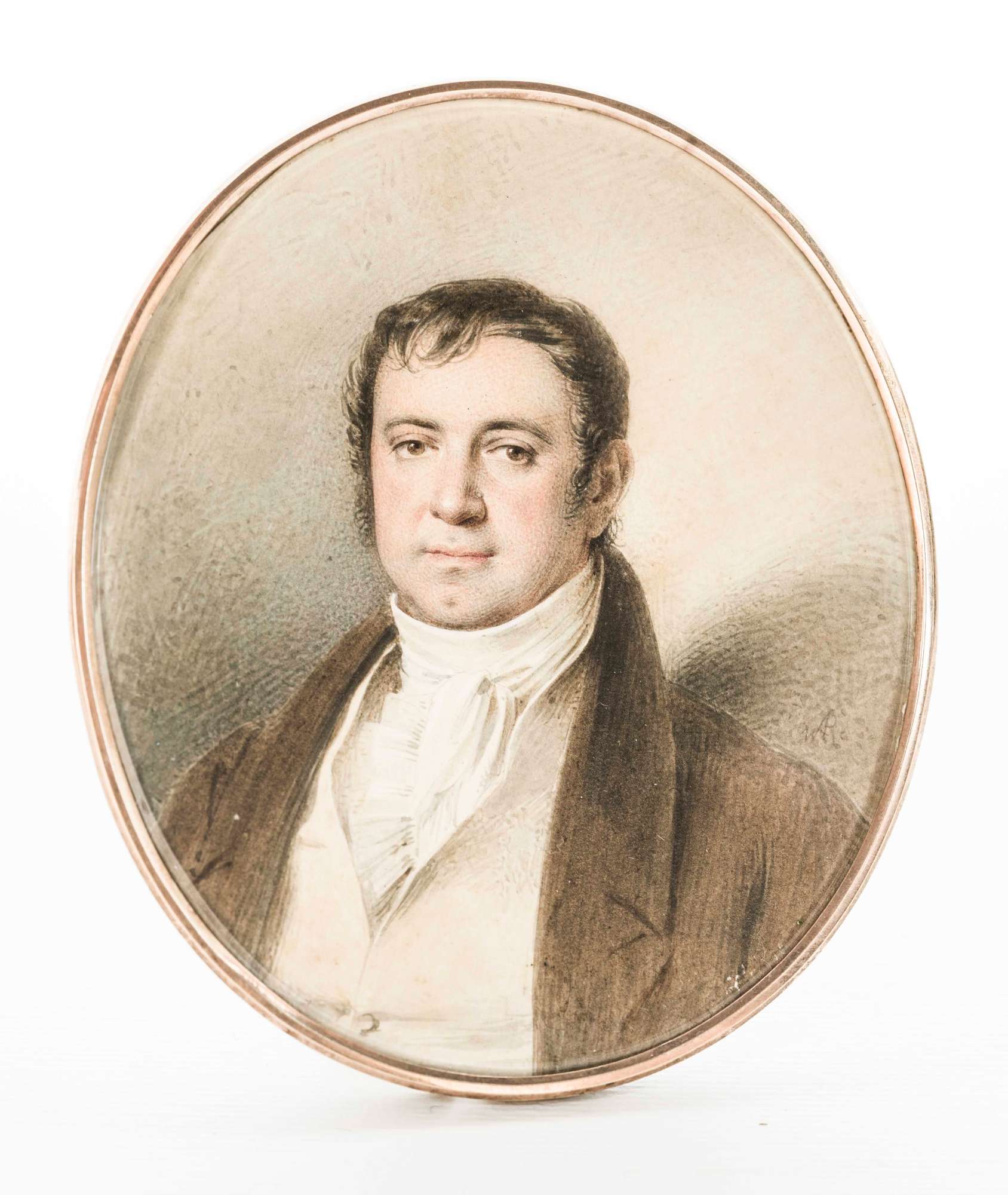 La miniatura, entrata nelle collezioni museali nel 1976 attraverso il legato Rusconi-Opuich, offre il ritratto di un uomo a mezza figura, vestito di rendigote marrone, gilet, camicia e cravatta bianche. A destra della figura vi è un monogramma di difficile lettura composto dalle lettere WR, di un autore attivo, come sembra suggerire la foggia dell’abbigliamento e i capelli alla Brutus con lunghe basette, nel primo quarto del XIX secolo.