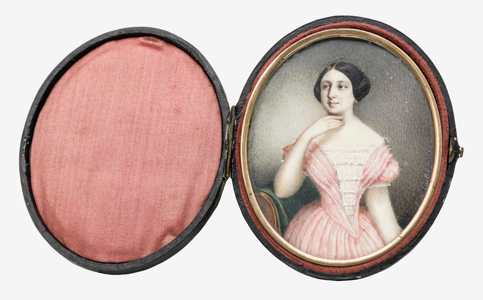 La miniatura è entrata nelle collezioni civiche nel 1976 attraverso il legato Rusconi-Opuich, in particolare della famiglia Fontana, giunto per vie ereditarie a Odinea Opuich, figlia di Adelaide Fontana, sorella dell’effigiata. La giovane raffigurata è Natalia Fontana (1835-1858), figlia di Carlo Antonio Fontana e Adelaide Reisden, qui raffigurata all'età di ventitré anni. La giovane dama posa seduta con il braccio appoggiato allo schienale e portato verso il mento; indossa un abito rosa con corpetto a scollatura larga, che termina a punta davanti, accentuando l'effetto di esilità del busto. Strisce di rouches in pizzo lo decorano, restringendosi verso il punto vita. Il volto è incorniciato da i capelli appuntati ‘a ciliegia’. Lungo il margine destro, la firma ascrive l’opera con certezza al miniaturista e fotografo Andrea De Castro, celebre per aver ritratto la nobiltà e la classe borghese triestina nel XIX secolo, che qui mostra qualche incertezza nella resa delle braccia e della mano. Natalia Fontana, oltre a essere stata effigiata da M. Stohl in un disegno con i fratelli Carlino e Adelina, è stata ritratta in un busto marmoreo da A. Cameroni, datato 1858 (CMSA inv. Rusconi n. 1576).
