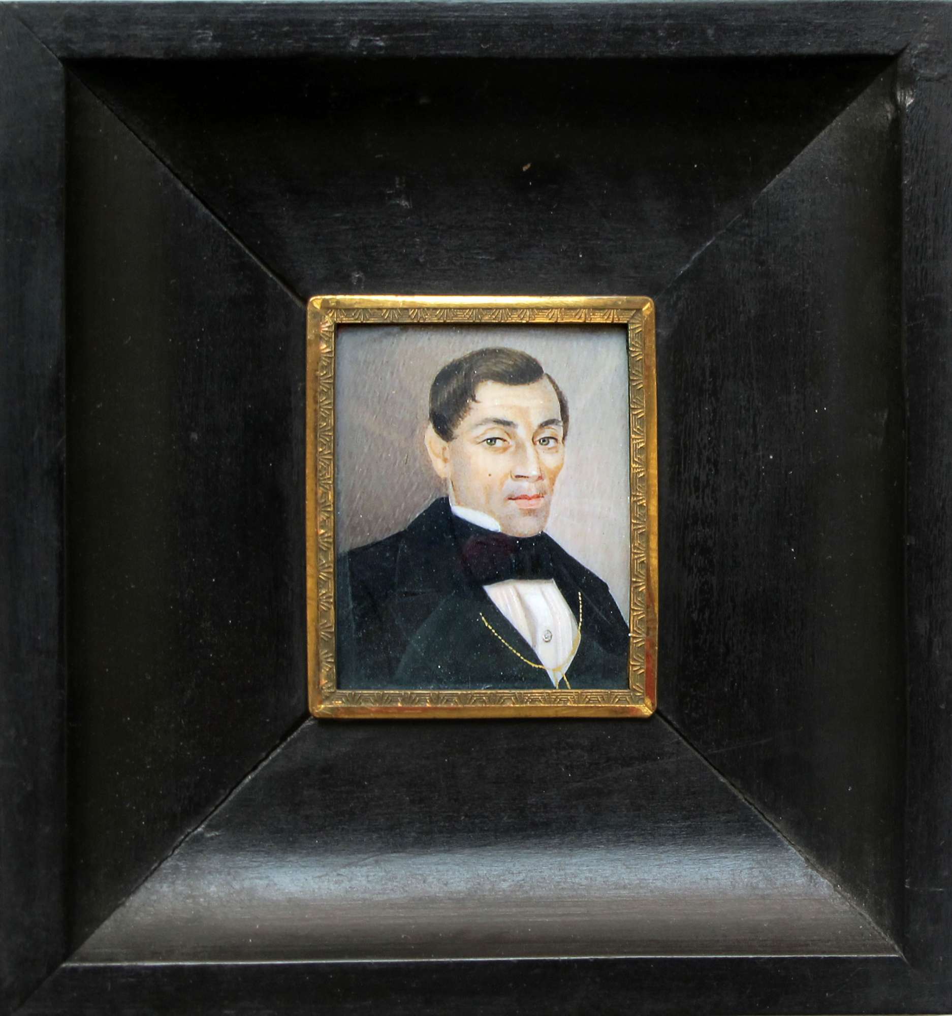 La miniatura, acquistata da Anna Maria Florio nel 1931, ritrae, secondo quanto riporta la scheda inventariale del museo, un uomo della famiglia Panzera. Il primo di questo casato, proveniente dalla Contea di Gorizia, a trasferirsi a Trieste fu Wenceslao, che, giunto nel 1788, esercitò l’avvocatura fino al 1794, quando venne nominato Consigliere del Tribunale cambio mercantile e Consolato al mare. Nel 1803 venne trasferito al Giudizio civico provinciale e l’anno successivo venne ascritto al patriziato triestino. Caprin, che lo ricorda frequentatore del salotto di Elisa Baciocchi, lo descrive quale “stimato giureconsulto, astuto indagatore del cuore umano, di memoria tenacissima, enciclopedia ambulante di aneddoti personali, instancabile divoratore di libri, e un pozzo di quella leggera erudizione che tien gaia e serena lo società” (1973, p. 135). Egli viveva con i figli Pompeo e Wenceslao (Cratey 1808, p. 288), sui quali poco si sa. Pompeo potrebbe essere riconosciuto in quel possidente e negoziante, nato a Gorizia nel 1786 e morto a Trieste nel 1849 (Stefani 1932). L’uomo ritratto in miniatura indossa una finanziera nera, come la cravatta annodata a farfalla, sopra una camicia bianca con colletto rigido, sulle quali spicca un gioiello; abbigliamento di gusto romantico, databile attorno al quarto decennio.