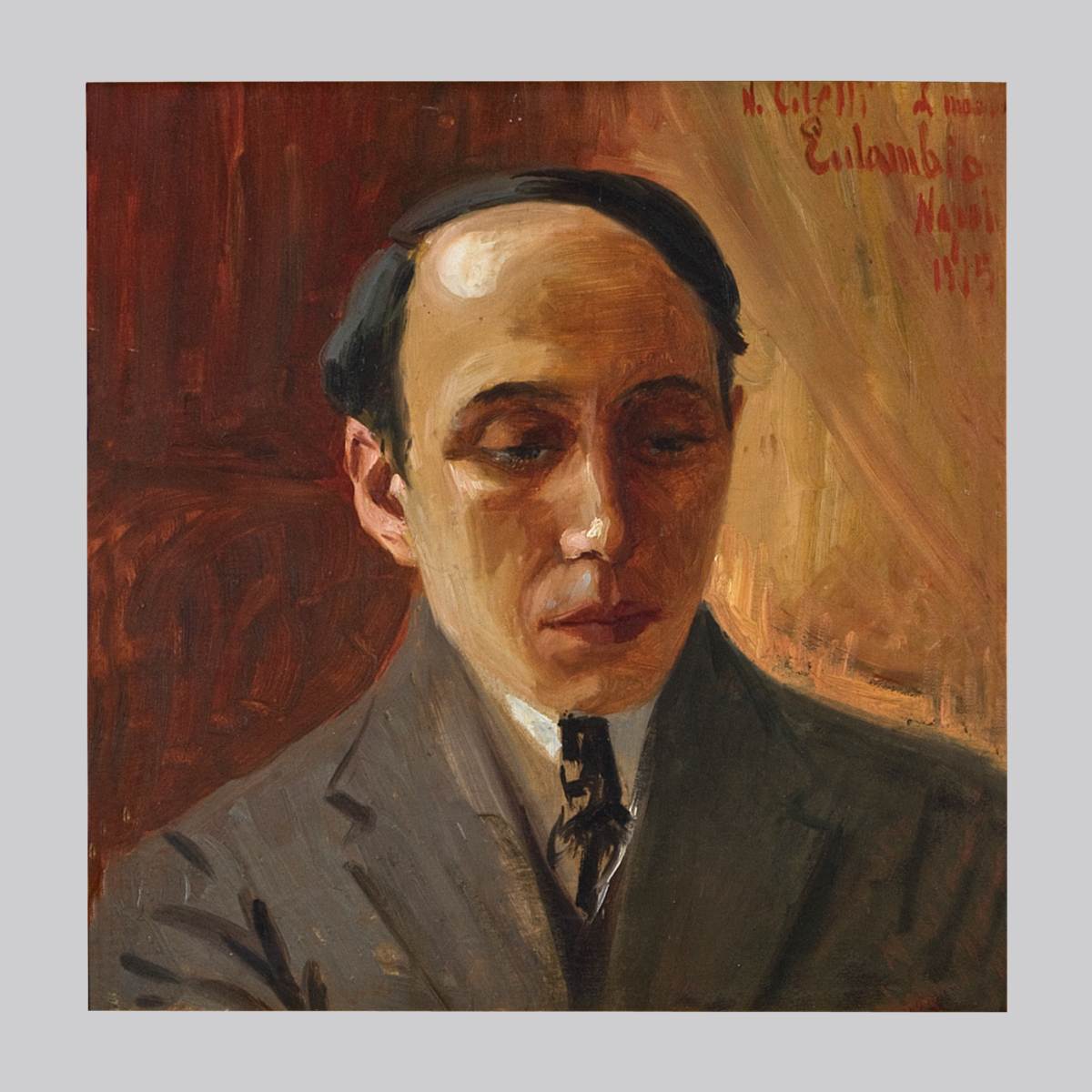 Il maestro Michele Eulambio è qui ritratto di fronte a mezzo busto. Indossa una camicia bianca, cravatta scusa al collo, giacca grigia. Lo sguardo è pensieroso e gli occhi socchiusi.