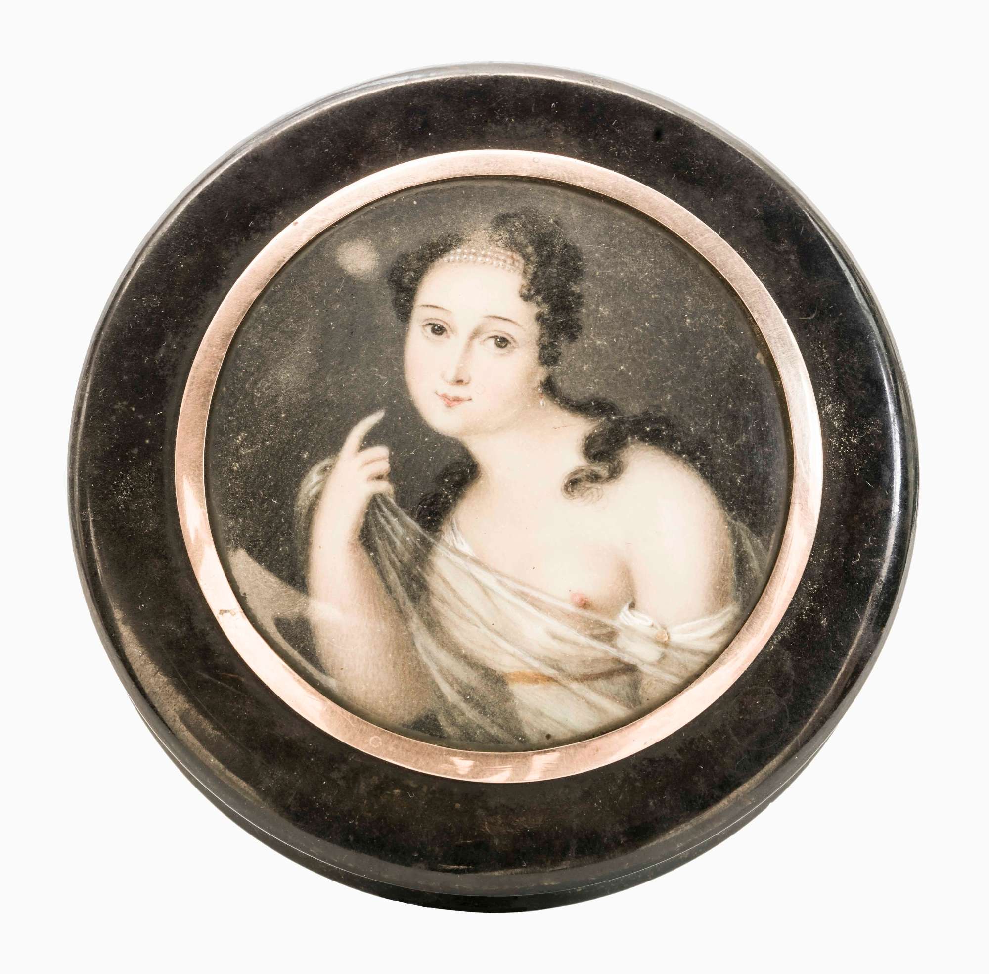 Scatola tonda in tartaruga sul cui coperchio vi è una miniatura raffigurante una donna con il seno velato su fondo nero.