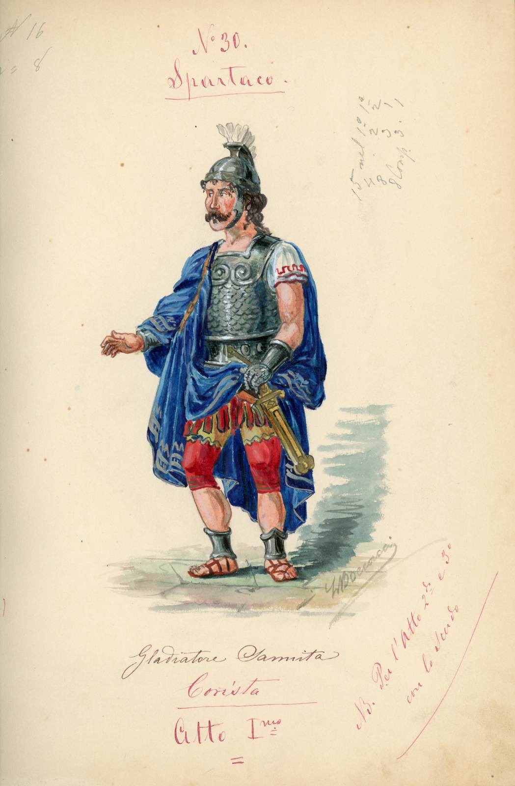 Spartaco, opera di Giuseppe Sinico. Figurino per il personaggio gladiatore sannita. Figura maschile intera, in abbigliamento militare. Corazza a squame, mantello azzurro scuro, elmo sul capo, calzoni rossi sotto il ginocchio, schinieri corti, sandali, gladio al fianco