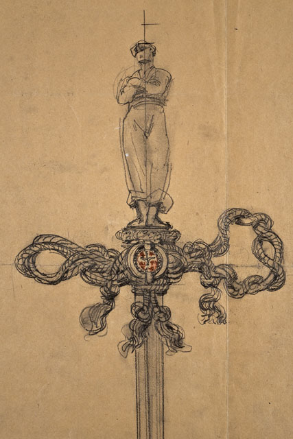 Si tratta di uno dei disegni progettuali del Faro della Vittoria, eseguiti da Arduino Berlam, che li donò ai Civici Musei di Storia ed Arte nel 1935, cfr. le schede da CMSAOAR06_3598 a CMSAOAR06_3634. In particolare, l'opera in esame testimonia le fasi ideative dello spadino d'onore donato dalla città di Trieste al grand'ammiraglio Paolo Camillo Thaon di Revel (Torino, 1859-Roma, 1948) il 3 febbraio 1924. Quest'ultimo, già capo di Stato Maggiore della Marina e comandante della flotta italiana durante la Grande Guerra, aveva donato al Comitato del Faro l'àncora del cacciatorpediniere Audace, che il 3 novembre 1918 aveva attraccato a Trieste, segnando la vittoria italiana sull'Impero austro-ungarico. Oltre all'àncora, l'ammiraglio consegnò la relativa catena e due proiettili della corazzata austroungarica "Viribus Unitis", affondata a Pola il 1° novembre 1918 (Zerboni 1999, pp. 72-75). Presso l'Archivio Generale del Comune di Trieste (Segreteria generale, prot.corr. 5/123-1923) si conserva il bozzetto definitivo della spada, eseguito da Arduino Berlam. Essa venne forgiata con una lama di baionetta della Brigata Sassari: l'impugnatura in argento ossidato era costituita dalla figura di marinaio che Giovanni Mayer aveva ipotizzato quale primo elemento decorativo del Faro, l'elsa composta da un intreccio di gomene a racchiudere lo stemma di Trieste in corallo con l'alabarda in platino. La statuetta venne fusa da Isidoro Bragadin di Venezia, mentre l'elsa dall'orefice Carlo Omet (cfr. Bigi - Guidi - Ugolini Bernasconi 2003, pp. 476-477).