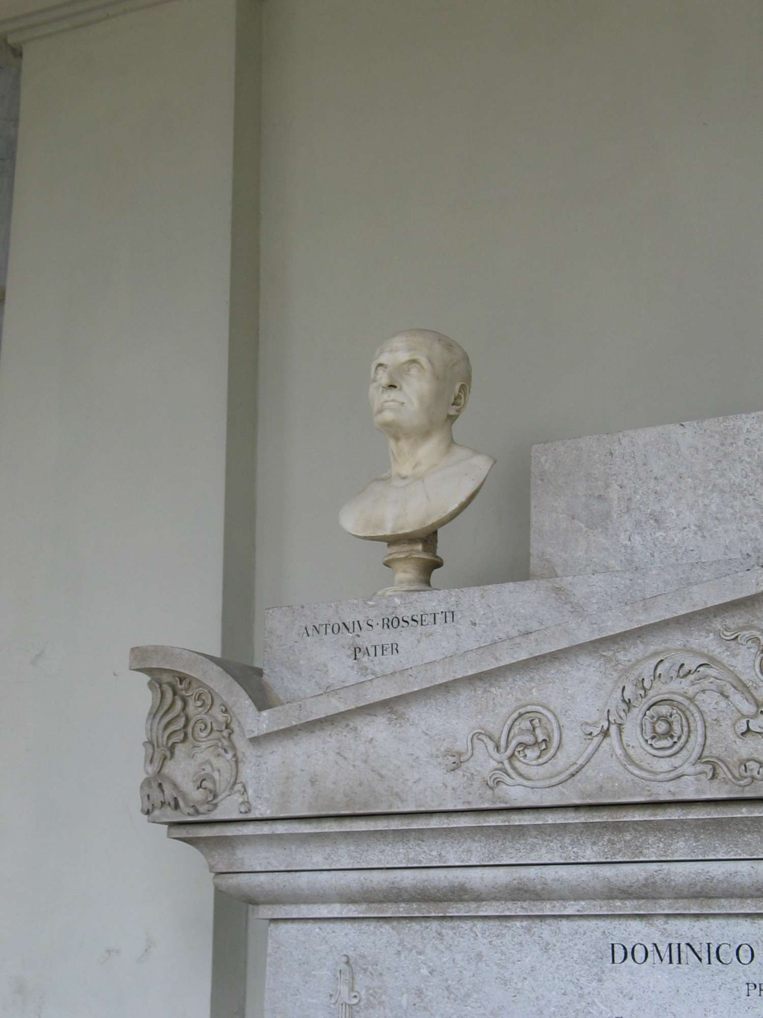 Sulla sommità di un grande sarcofago di ispirazione classica addossata al muro di fondo sono collocati l'erma di Domenico Rossetti, affiancata dai busti dei genitori Antonio Rossetti (Fiume 1722-Trieste 1814) e Orsola nata Perinello (1732-1812). Il frontone del coperchio del sarcofago è decorato da un rilievo raffigurante una farfalla circondata da due rami di alloro disposti a corona e affiancata da girali vegetali. Ai lati dell'iscrizione sono poste due fiaccole accese rovesciate.