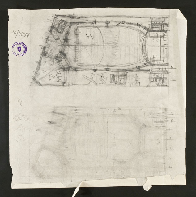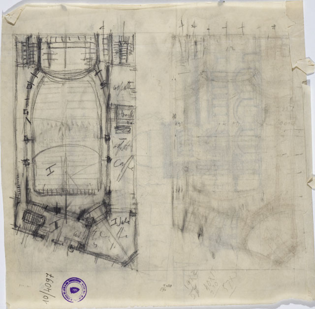 Al recto, schizzi della facciata principale e laterale di un un cine-teatro; al verso, studio planimetrico dello stesso.