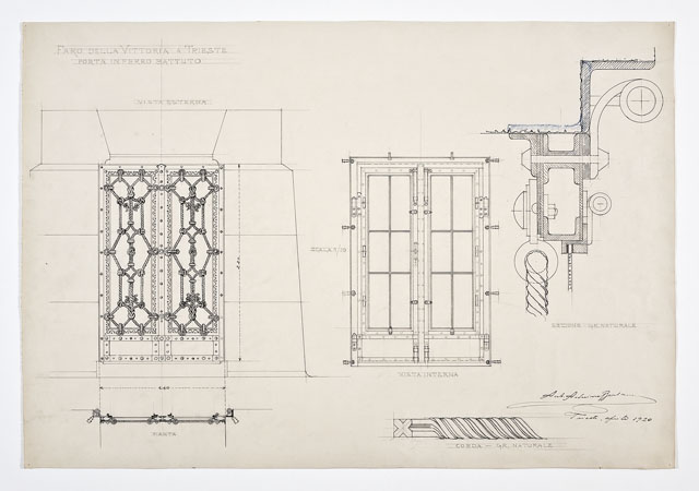 Si tratta di uno dei disegni progettuali del Faro della Vittoria, eseguiti da Arduino Berlam, che li donò ai Civici Musei di Storia ed Arte nel 1935, cfr. le schede da CMSAOAR06_3598 a CMSAOAR06_3634. In particolare, la tavola è lo studio preparatorio per la porta d'accesso al Faro, da eseguirsi in ferro battuto. A partire dal 1919, Arduino Berlam lavorò alla progettazione del Faro della Vittoria, architettura celebrativa e simbolica, che rispondeva al desiderio di esaltazione della patria e dell’italianità di Trieste redenta, sorto dopo la Grande Guerra, e alla necessità di onorare i suoi caduti. Già durante il conflitto, Berlam aveva ipotizzato di erigere un faro in onore di Nazario Sauro, eroe del mare, sulla punta istriana di Salvore, a poca distanza da Capodistria (cfr. CMSAOAR06_3631). Tuttavia questa prima idea fu modificata a guerra conclusa, quando la Lega navale propose di costruire il faro a Trieste, per sostituire l’obsoleta lanterna di Pietro Nobile. Dal giugno 1919, quando il progetto di massima venne approvato dal Consiglio Superiore dei Lavori Pubblici a Roma, al 1927, quando il faro fu inaugurato, il suo iter costruttivo fu tormentato da problemi e ritardi causati da divergenze di ordine tecnico-artistico e dall’antagonismo contro Arduino Berlam. Edificato sulle fondamenta del forte austriaco Kressich, costruito sul colle di Gretta nel 1854, su progetto dell'architetto Karl Möring, il faro presenta una gradinata monumentale alla cui sommità si trova un solettone. Su di esso è posta la lapide con l'epigrafe dedicatoria «A. D. MCMXXVII / SPLENDI E RICORDA / I CADUTI SUL MARE / MCMXV – MCMXVIII». Il manufatto prosegue con uno zoccolo a campana da cui pende l'àncora del caccia-torpediniere Audace, che il 3 novembre 1918 attraccò sul molo triestino ad esso intitolato. Sull'avancorpo del ballatoio, da cui si innalza il fusto della colonna, poggia la statua del Marinaio ignoto, eseguita da Giovanni Mayer. La colonna, in cemento armato, è rivestita da blocchi di pietra di Orsera e termina con un capitello che sorregge il terrazzo su cui poggia la lanterna. Quest'ultima è circondata da un ulteriore ballatoio in ferro ed è coronata da una cupola di rame a squame, su cui svetta una Vittoria alata, opera anch'essa di Mayer e forgiata da Giacomo Sreboth.