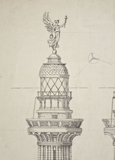 Già pubblicato da Berlam nel 1919 sulle pagine de "L'architettura italiana", il disegno illustra il progetto del Faro per il porto di Trieste, ideato da Arduino Berlam e approvato dal Ministero dei Lavori Pubblici nel novembre 1921 (cfr. Zerboni 1999, p. 15). Esso illustra il progetto nella versione del gruppo scultoreo a "nave rostrata" (Ivi, p. 67 e sgg.). Si tratta di uno dei disegni progettuali del Faro della Vittoria, donati dallo stesso Berlam ai Civici Musei di Storia ed Arte nel 1935, cfr. le schede da CMSAOAR06_3598 a CMSAOAR06_3634. A partire dal 1919, l'architetto triestino lavorò alla progettazione del Faro della Vittoria, architettura celebrativa e simbolica, che rispondeva al desiderio di esaltazione della patria e dell’italianità di Trieste redenta, sorto dopo la Grande Guerra, e alla necessità di onorare i suoi caduti. Già durante il conflitto, Berlam aveva ipotizzato di erigere un faro in onore di Nazario Sauro, eroe del mare, sulla punta istriana di Salvore, a poca distanza da Capodistria (cfr. CMSAOAR06_3631). Tuttavia questa prima idea fu modificata a guerra conclusa, quando la Lega navale propose di costruire il faro a Trieste, per sostituire l’obsoleta lanterna di Pietro Nobile. Dal giugno 1919, quando il progetto di massima venne approvato dal Consiglio Superiore dei Lavori Pubblici a Roma, al 1927, quando il faro fu inaugurato, il suo iter costruttivo fu tormentato da problemi e ritardi causati da divergenze di ordine tecnico-artistico e dall’antagonismo contro Arduino Berlam. Edificato sulle fondamenta del forte austriaco Kressich, costruito sul colle di Gretta nel 1854, su progetto dell'architetto Karl Möring, il faro presenta una gradinata monumentale alla cui sommità si trova un solettone. Su di esso è posta la lapide con l'epigrafe dedicatoria «A. D. MCMXXVII / SPLENDI E RICORDA / I CADUTI SUL MARE / MCMXV – MCMXVIII». Il manufatto prosegue con uno zoccolo a campana da cui pende l'àncora del caccia-torpediniere Audace, che il 3 novembre 1918 attraccò sul molo triestino ad esso intitolato. Sull'avancorpo del ballatoio, da cui si innalza il fusto della colonna, poggia la statua del Marinaio ignoto, eseguita da Giovanni Mayer. La colonna, in cemento armato, è rivestita da blocchi di pietra di Orsera e termina con un capitello che sorregge il terrazzo su cui poggia la lanterna. Quest'ultima è circondata da un ulteriore ballatoio in ferro ed è coronata da una cupola di rame a squame, su cui svetta una Vittoria alata, opera anch'essa di Mayer e forgiata da Giacomo Sreboth.