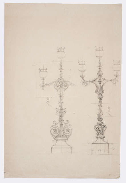 Studio parzialmente quotato per due lampade a candelabro dalla diversa struttura compositiva, per il Faro della Vittoria.