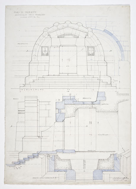 Si tratta di uno dei disegni progettuali del Faro della Vittoria, eseguiti da Arduino Berlam, che li donò ai Civici Musei di Storia ed Arte nel 1935, cfr. le schede da CMSAOAR06_3598 a CMSAOAR06_3634. In particolare, la tavola, già pubblicata nel 1919, sulle pagine de “L’architettura italiana”, descrive nel dettaglio l'ingresso al faro. Proprio a partire da quell’anno, Arduino Berlam lavorò alla progettazione del Faro della Vittoria, architettura celebrativa e simbolica, che rispondeva al desiderio di esaltazione della patria e dell’italianità di Trieste redenta, sorto dopo la Grande Guerra, e alla necessità di onorare i suoi caduti. Già durante il conflitto, Berlam aveva ipotizzato di erigere un faro in onore di Nazario Sauro, eroe del mare, sulla punta istriana di Salvore, a poca distanza da Capodistria (cfr. CMSAOAR06_3631). Tuttavia questa prima idea fu modificata a guerra conclusa, quando la Lega navale propose di costruire il faro a Trieste, per sostituire l’obsoleta lanterna di Pietro Nobile. Dal giugno 1919, quando il progetto di massima venne approvato dal Consiglio Superiore dei Lavori Pubblici a Roma, al 1927, quando il faro fu inaugurato, il suo iter costruttivo fu tormentato da problemi e ritardi causati da divergenze di ordine tecnico-artistico e dall’antagonismo contro Arduino Berlam. Edificato sulle fondamenta del forte austriaco Kressich, costruito sul colle di Gretta nel 1854, su progetto dell'architetto Karl Möring, il faro presenta una gradinata monumentale alla cui sommità si trova un solettone. Su di esso è posta la lapide con l'epigrafe dedicatoria «A. D. MCMXXVII / SPLENDI E RICORDA / I CADUTI SUL MARE / MCMXV – MCMXVIII». Il manufatto prosegue con uno zoccolo a campana da cui pende l'àncora del caccia-torpediniere Audace, che il 3 novembre 1918 attraccò sul molo triestino ad esso intitolato. Sull'avancorpo del ballatoio, da cui si innalza il fusto della colonna, poggia la statua del Marinaio ignoto, eseguita da Giovanni Mayer. La colonna, in cemento armato, è rivestita da blocchi di pietra di Orsera e termina con un capitello che sorregge il terrazzo su cui poggia la lanterna. Quest'ultima è circondata da un ulteriore ballatoio in ferro ed è coronata da una cupola di rame a squame, su cui svetta una Vittoria alata, opera anch'essa di Mayer e forgiata da Giacomo Sreboth.