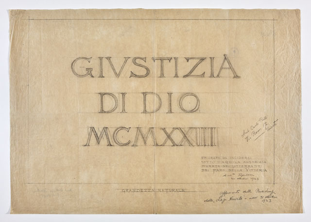 Progetto per un'epigrafe da incidersi, come recita l'iscrizione, sotto l'aquila austriaca murata nei sotterranei del Faro della Vittoria. Eseguito dall'architetto Arduino Berlam il 30 ottobre 1923, fu approvato dalla Presidenza della Lega Navale il giorno successivo. Si tratta di uno dei disegni progettuali del Faro della Vittoria, donati da Arduino Berlam ai Civici Musei di Storia ed Arte nel 1935, cfr. schede da CMSAOAR06_3598 a CMSAOAR06_3634. Per le vicende storico-critiche del Faro della Vittoria, si rinvia alla scheda CMSAOAR06_3598.
