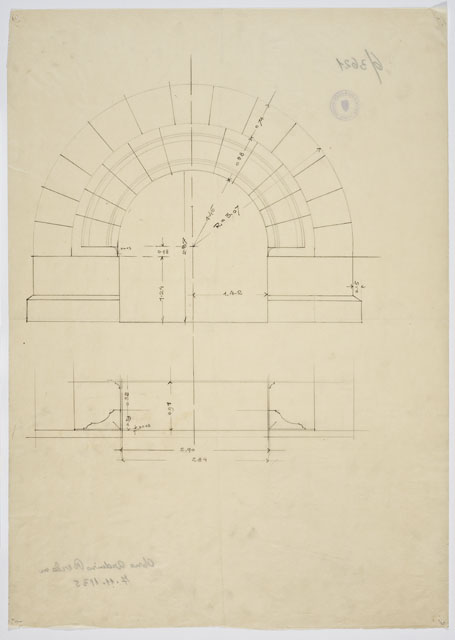 Si tratta di uno dei disegni progettuali del Faro della Vittoria, eseguiti da Arduino Berlam, che li donò ai Civici Musei di Storia ed Arte nel 1935, cfr. le schede da CMSAOAR06_3598 a CMSAOAR06_3634. In particolare, lo studio grafico descrive la struttura del portale strombato di accesso alla struttura. Si tratta di uno schizzo affine, seppur meno dettagliato, alla tavola CMSAOAR06_3609. A partire dal 1919, Arduino Berlam lavorò alla progettazione del Faro della Vittoria, architettura celebrativa e simbolica, che rispondeva al desiderio di esaltazione della patria e dell’italianità di Trieste redenta, sorto dopo la Grande Guerra, e alla necessità di onorare i suoi caduti. Già durante il conflitto, Berlam aveva ipotizzato di erigere un faro in onore di Nazario Sauro, eroe del mare, sulla punta istriana di Salvore, a poca distanza da Capodistria (cfr. CMSAOAR06_3631). Tuttavia questa prima idea fu modificata a guerra conclusa, quando la Lega navale propose di costruire il faro a Trieste, per sostituire l’obsoleta lanterna di Pietro Nobile. Dal giugno 1919, quando il progetto di massima venne approvato dal Consiglio Superiore dei Lavori Pubblici a Roma, al 1927, quando il faro fu inaugurato, il suo iter costruttivo fu tormentato da problemi e ritardi causati da divergenze di ordine tecnico-artistico e dall’antagonismo contro Arduino Berlam. Edificato sulle fondamenta del forte austriaco Kressich, costruito sul colle di Gretta nel 1854, su progetto dell'architetto Karl Möring, il faro presenta una gradinata monumentale alla cui sommità si trova un solettone. Su di esso è posta la lapide con l'epigrafe dedicatoria «A. D. MCMXXVII / SPLENDI E RICORDA / I CADUTI SUL MARE / MCMXV – MCMXVIII». Il manufatto prosegue con uno zoccolo a campana da cui pende l'àncora del caccia-torpediniere Audace, che il 3 novembre 1918 attraccò sul molo triestino ad esso intitolato. Sull'avancorpo del ballatoio, da cui si innalza il fusto della colonna, poggia la statua del Marinaio ignoto, eseguita da Giovanni Mayer. La colonna, in cemento armato, è rivestita da blocchi di pietra di Orsera e termina con un capitello che sorregge il terrazzo su cui poggia la lanterna. Quest'ultima è circondata da un ulteriore ballatoio in ferro ed è coronata da una cupola di rame a squame, su cui svetta una Vittoria alata, opera anch'essa di Mayer, forgiata da Giacomo Sreboth.