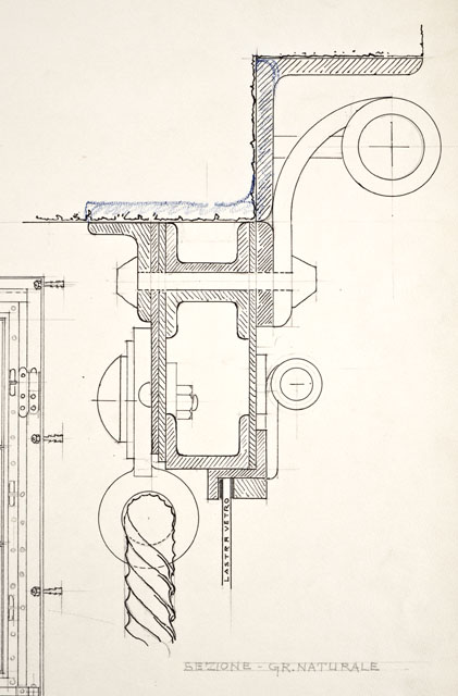 Studio per la porta in ferro battuto del Faro della Vittoria. La tavola contiene: vista esterna con pianta e vista interna in scala 1:10; sezione e dettaglio del motivo decorativo a corda a grandezza naturale.