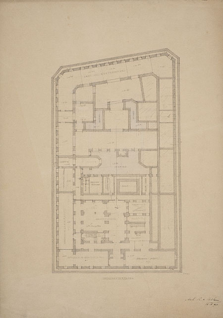 Planimetria del piano semisotterraneo di un edificio, con sezione delle murature tratteggiate. La destinazione dei vani è indicata da iscrizioni. Le zone acquerellate di azzurro corrispondono ai cortili.