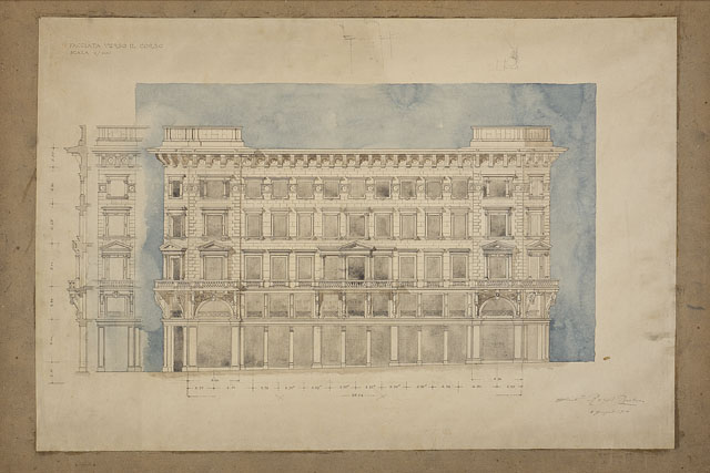 Il disegno in esame appartiene al "Progetto per l'edificio della Riunione Adriatica di Sicurtà", cfr. schede CMSAOAR10_4176-CMSAOAR10_4206. Agli inizi del Novecento il direttore generale della Riunione Adriatica di Sicurtà, Adolfo de Frigyessy, e suo figlio Arnoldo, decisero di realizzare una nuova sede di rappresentanza per la compagnia a Trieste. Acquistato un ampio lotto già edificato tra la piazza Nuova e le vie S. Caterina, S. Antonio e il Corso, e demolite le precedenti costruzioni, indissero nel luglio 1909 un concorso internazionale a inviti per la progettazione di un nuovo palazzo. Oltre a Ruggero e Arduino Berlam, vi parteciparono gli architetti Ignác Alpar, Ludwig Baumann, Max Littmann, Luigi Broggi, Giacomo Zamattio, Giorgio Zaninovich, Enrico Nordio e Ludovico Braidotti. Nel bando si richiedeva che il palazzo contenesse un semi-sotterraneo, un piano elevato, un ammezzato, tre piani superiori più un sottotetto; ma non si davano indicazioni sulla distribuzione interna degli ambienti e su requisiti tecnologici. Nel novembre 1909 la giuria selezionò, tra i progetti pervenuti, quelli di Alpar, Zammattio e dei Berlam (Lettis in Rovello 2007, p. 312) per la seconda fase del concorso. Tuttavia Zammattio e Alpar non si presentarono, cosicché lo studio Berlam, unico rimasto fra i selezionati, ricevette l’incarico. Seguì una fase in cui Ruggero e Arduino Berlam vennero costantemente seguiti dalla committenza nell’elaborazione dell’assetto generale e di ogni minuto dettaglio dell’edificio. La direzione della compagnia assicurativa voleva che lo stabile fosse destinato per metà a sede della società, cioè verso la Piazza Nuova (odierna Piazza della Repubblica); mentre il lato opposto, verso il Corso, fosse adibito a negozi, al pianterreno, e abitazioni. Anche il piano prospiciente la via S. Antonio (attuale via Dante) era riservato agli esercizi commerciali. Il progetto definitivo dei Berlam, datato 2 dicembre 1910, venne approvato dal Magistrato civico il 12 gennaio 1911; il permesso di fabbrica è del 28 giugno 1911. L’Impresa Carlo Bonetti costruì il palazzo, che fu inaugurato il 7 aprile 1914. Si tratta di un capolavoro del tardo eclettismo europeo, in cui si recuperano gli stilemi della tradizione architettonica del tardo Cinquecento. Nel palazzo, articolato in cinque piani, gli architetti si sono rifatti all’architettura “di facciata, ai palazzi italiani del secolo XVI” (Berlam cit. in Lettis in Rovello 2007, p. 313, nota 9). Quanto al disegno in esame, esso illustra la proposta pressoché definitiva della facciata sul Corso. Datato giugno 1910, il disegno mantiene la soluzione degli avancorpi, presente nei precedenti progetti CMSAOAR10_4198 e CMSAOAR10_4199, ma in continuità con gli altri tre lati dell’edificio, presenta finestre timpanate al primo piano nobile in corrispondenza dei due corpi aggettanti e dell’asse centrale. All’ultimo livello, le finestre sono inserite entro una fascia a rosoni. Un cornicione aggettante delimita il tetto, che in corrispondenza degli avancorpi presenta attici percorsi da lesene.