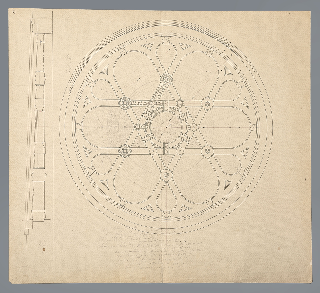 Il disegno presenta il rosone della Sinagoga di Trieste con indicazioni tecniche e misure.