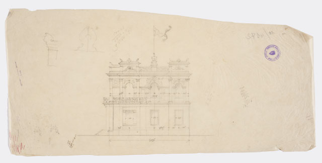La tavola contiene il prospetto laterale, quotato, di una palazzina con due livelli sopra il suolo e due schizzi di dettagli architettonici.