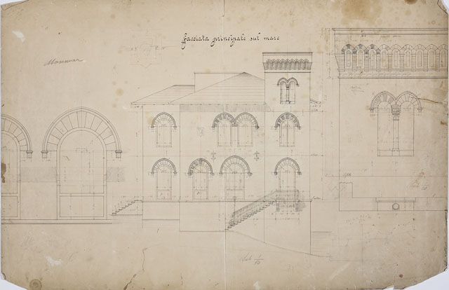 Disegno architettonico decurtato. Al centro è descritta la facciata principale di una villa in scala 1:50. A sinistra, è sviluppato il particolare delle finestre del primo livello; mentre a destra, dettaglio dell'alzato della torretta con bifora, pianta di quest'ultima, in scala 1:20. Sul verso, schizzo planimetrico.