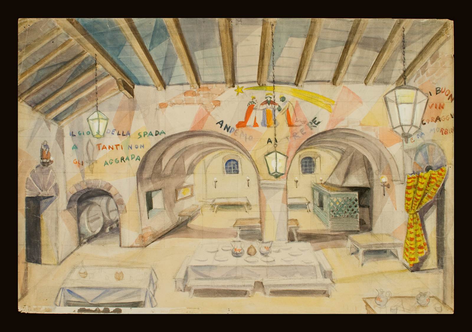 Trittico, opera di Antonio Illersberg, Carneval. interno di cantina/ taverna "Ai tre re", ambiente caratterizzato da due grandi archi e soffitti a volta, tavolo lungo apaprecchiato al centro, altri tavoli sparsi, botti e focolare. Disegni e scritte sui muri: Il gioco della spada a tanti non gli aggrada, andemo ai tre re, ...buon vin dà coraggio e dà morbin.