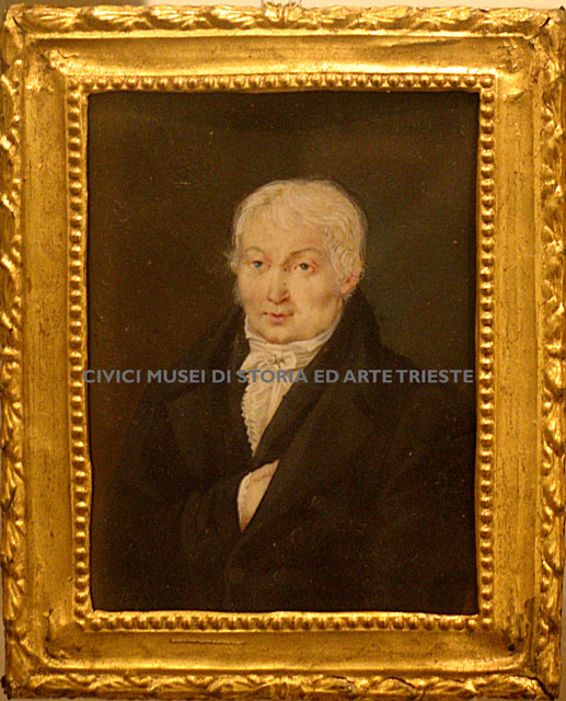 La miniatura è stata acquisita dai Civici Musei presso Eleonora Pollack nel 1924, venendo inventariata come ritratto di Caliman de Minerbi (Venezia 1782-Trieste 1878), grossista, proprietario di una fabbrica a Trieste, presidente della Camera di Commercio (registro "Acquisti 1902-1938"). Esponente più rappresentativo della famiglia de Minerbi, sposò Chiara d'Angeli (1787-1864) a Venezia nel 1805, da cui ebbe due figlie: Nina (Rachele), nata nel 1810, e Clementina, nata nel 1816, che a sua volta maritò Leone Hierschel. Caliman de Minerbi fu membro del consiglio della Comunità israelitica, vice-presidente del Consiglio municipale, vice-presidente della Camera di Commercio, azionista e dirigente di Società d'Assicurazione nonché della Società Filarmonico-Drammatica e fondatore degli Asili d’Infanzia. Nel suo necrologio è definito “uomo d’illibata onestà, [..] di mente accortissima, di cuore sensibile, di esemplare modestia” (Il Corriere israelitico 1876, p. 284), qualità che sembrano trasparire nel piccolo ritratto. Eppure, malgrado le informazioni documentarie, l’identificazione dell’effigiato pare poco convincente al confronto con il ritratto litografico di Calimam de Minerbi, eseguito nel 1860 da Josef Kriehuber.