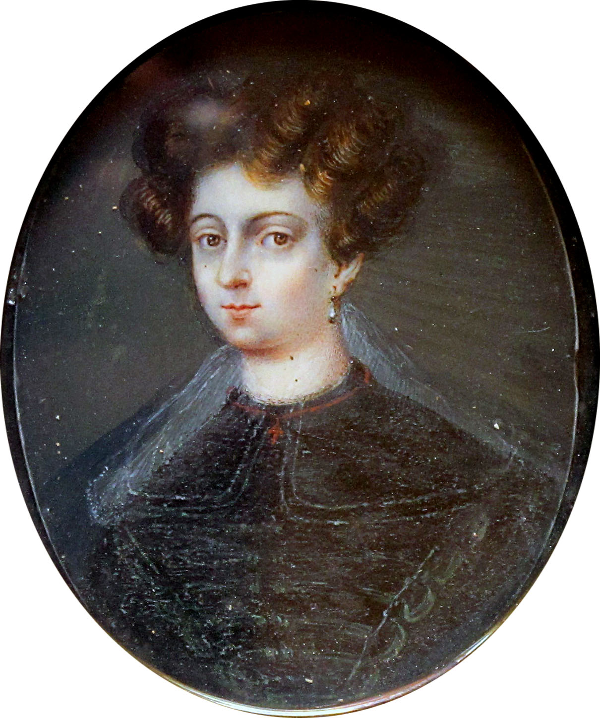 Dipinto in miniatura di forma ovale raffigurante una donna, che indossa un abito scuro.