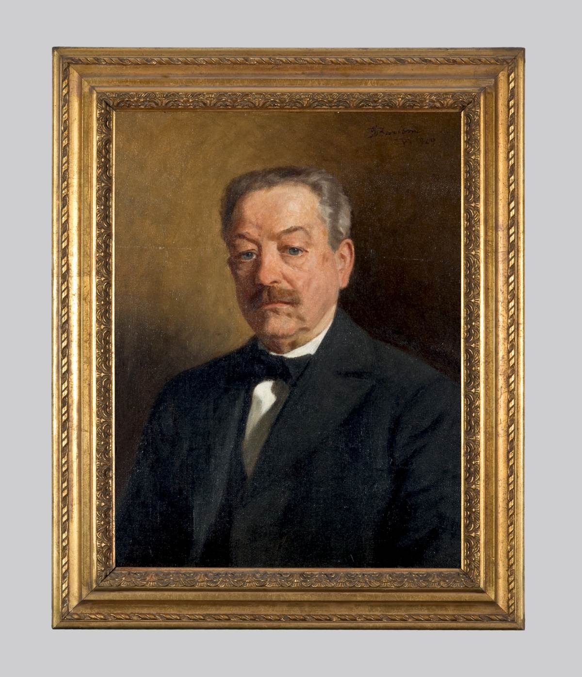 Carlo Schmidl ritratto a mezzobusto di fronte leggermente ruotato a destra. Indossa giacca pesante nera, panciotto, camicia bianca e papillon nero. Porta lunghi baffi.