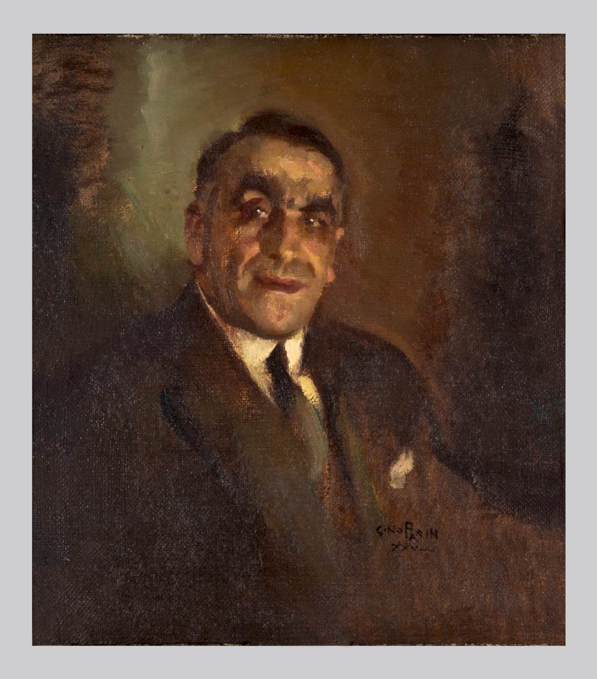 Nato a Rovigno d'Istria il 29 luglio del 1873, discendente da una famiglia che aveva dato valorosi capitani alla Repubblica di Venezia ne continuò la "tradizione di italianità". Da fervido irredentista studiò presso le università di Roma e Genova (dove si laureò in giurisprudenza). Nelle capitale iniziò a recitare facendosi notare fra la borghesia riuscendo ad emergere e diventare celebre attore comico riconosciuto a livello nazionale. Gino Parin lo ritrae a mezzo busto, non più giovanissimo con un sorriso ironico. Il dipinto risulta fortemente realistico il pittore infatti ha colto e reso eccelttentemente il volto dell'effigiato.