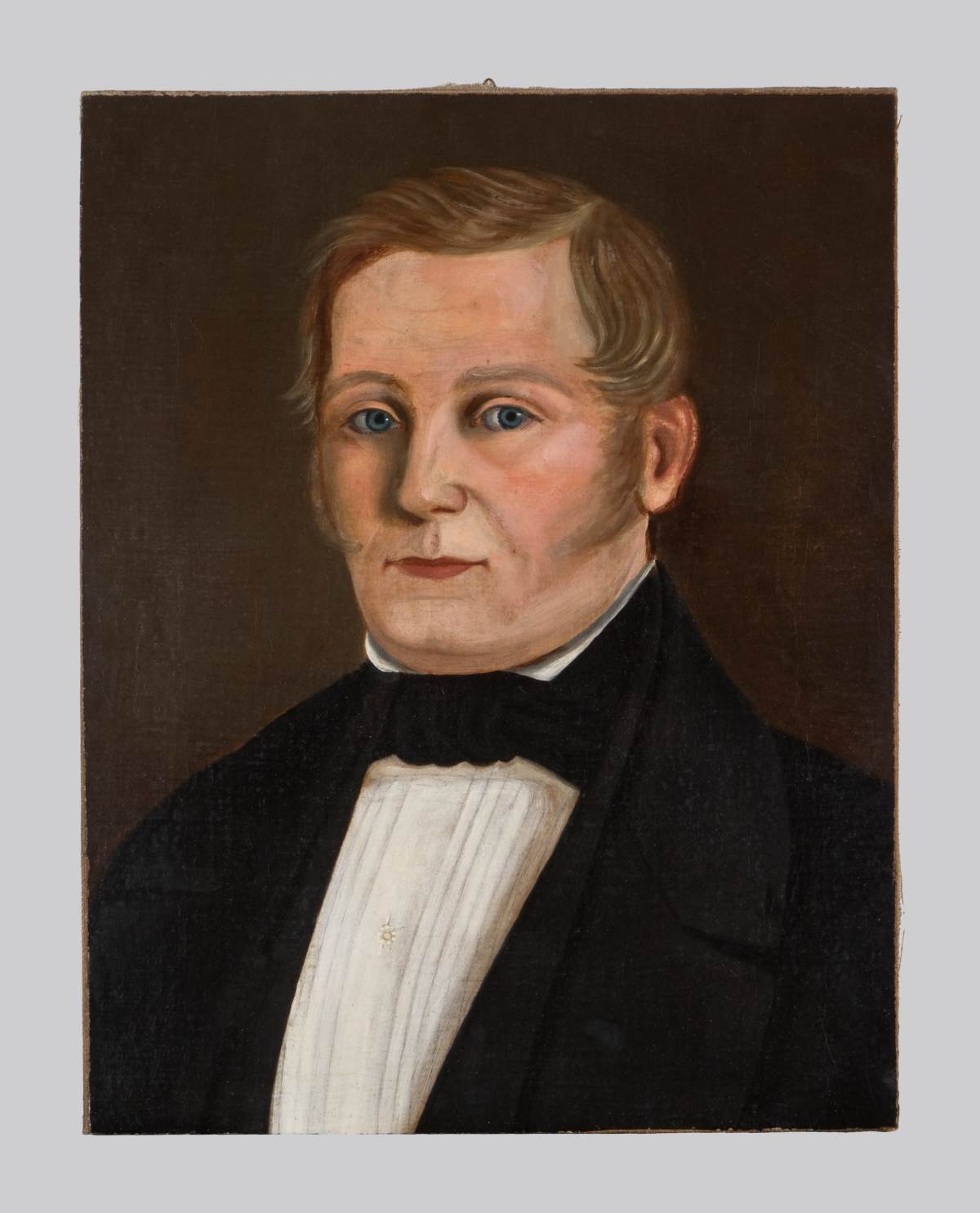 Ritratto del padre di Giuseppe Kaschmann ritratto a mezzo busto di fronte leggermente girato a sinistra. Indossa camicia plissettata bianca, un fiocco nero al collo, giacca nera abbottonata