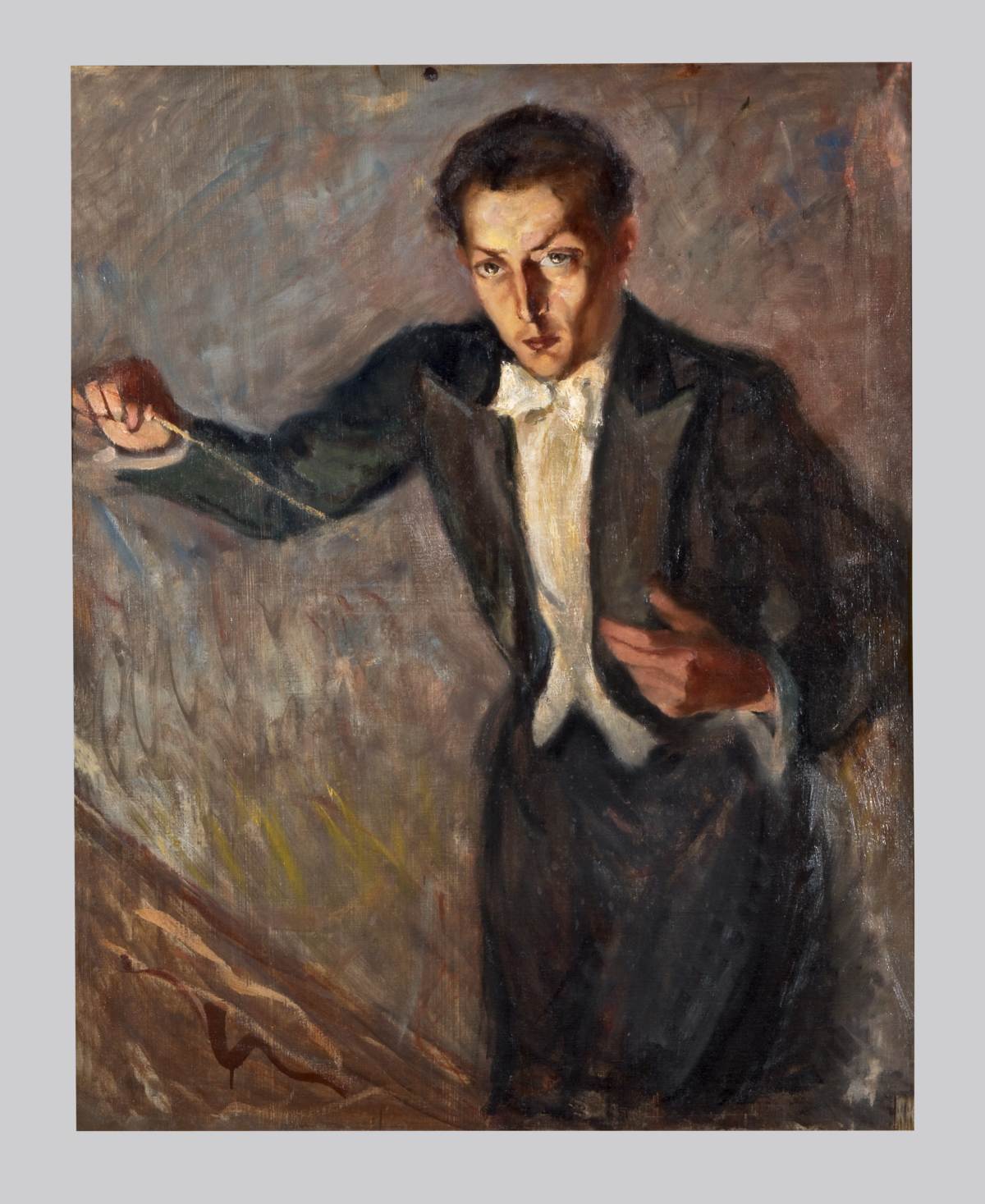 Nel dipinto vediamo il giovane compositore, colto di tre quarti nell'atto di dirigere un'orchestra. Il volto appare ben illuminato e concentrato nella direzione. Come da consuetudine il Maestro indossa un abito nero a code con camicia e farfallino bianco e tiene nella sua mano destra la bacchetta.